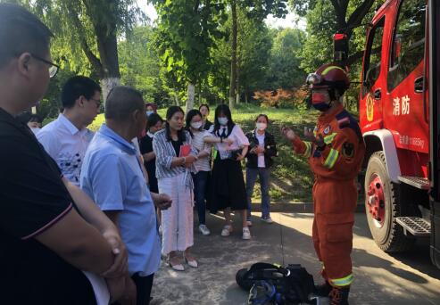 在消防器材展示环节中,消防员耐心细致的讲解了抢险救援服、空气呼吸器、切割机、破拆工具组等消防装备器材的使用方法,并邀请教职工现场体验了消防救援及灭火装备。