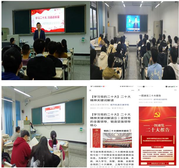 为充分认识党的二十大的重大意义,准确领会把握党的二十大精神的思想精髓和核心要义,城市轨道交通学院组织师生开展“习语进教室”主题活动,扎实推动党的二十大精神在青年学子头脑中落地生根,同时帮助解决学生生活学习中的实际困难。 推动习近平新时代中国特色社会主义思想和党的二十大精神入脑入心。将党的二十大精神融入立德树人全过程, 坚持德技并修,教育引导学生衷心拥护党的领导和中国特色社会主义制度,把小我融入大我、融入中华民族伟大复兴。