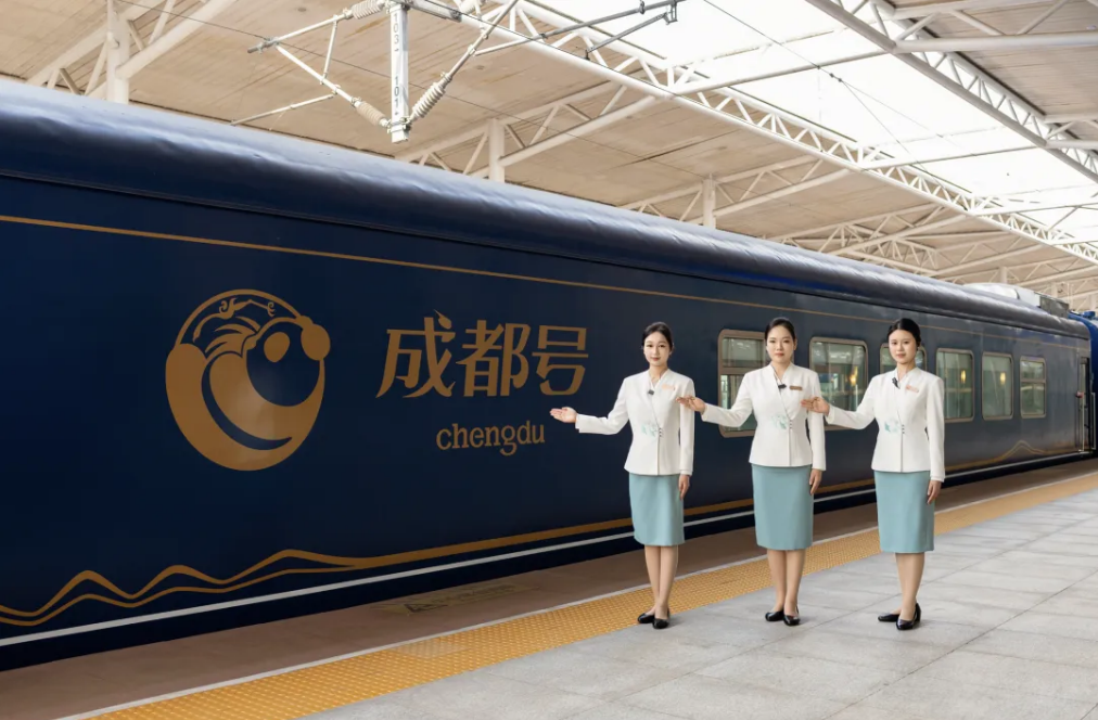 “熊猫专列·成都号”由中国铁路成都局集团公司与成都文旅集团共同打造的西南地区首列熊猫主题高品质旅游列车,列车全列编组18辆,其中“悠然居”、“诗意居”12辆是包间,共有54个包房,定员108个席位。列车还设有“乐府厅”、“流云阁”娱乐车2辆以及“金熊猫餐厅”餐车等配套车辆。 “熊猫管家”李千惠表示,“这次试运行是全流程实岗训练,对我来说也是一次很大的考验,但是前期已经做了充足的准备,我有信心把各项工作做好做到位”。同时,她介绍到,每个包厢内都有智能控制系统、茶水吧和小冰箱,列车上还设有儿童活动区、阅读区以及按摩椅、多功能茶室等,旅途间隙还准备了具有民族风情的舞蹈、歌曲等节目演出,将为乘客提供更加舒适的旅途环境。