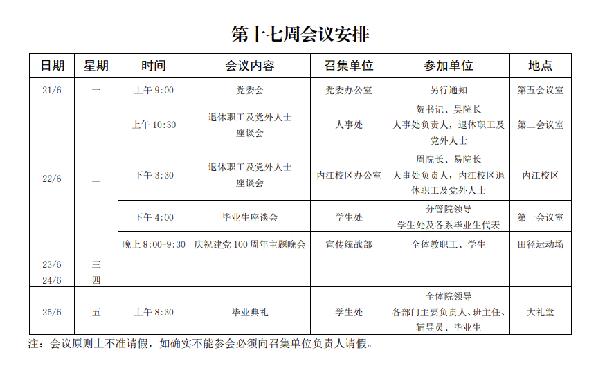 第十七周会议安排