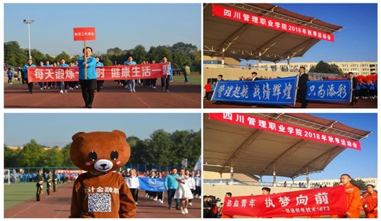 10月31日上午8点20分,四川管理职业学院2018年运动会在成都校区田径运动场正式拉开帷幕。学院全体领导出席开幕式,各部门、各系(部)的负责人,全体师生参加了开幕式。 金秋送爽,丹桂飘香。开幕式上,各方队伴随着《运动员进行曲》庄严入场。随后,各院系的104个班级代表队高举院旗,高呼院训,喊着嘹亮的口号,怀着坚定的信念,迈着整齐的步伐,进入会场。这期间,各院系都派出了节目表演队,为本次比赛加油助威,彰显了青春活力。 图1 国旗护卫队、彩旗队、鲜花队、青年志愿者方队入场 图2 教工队和各系部入场 图3 各系部文艺表演 院长周立同志致开幕词。他代表学院对运动会的顺利召开表示热烈地祝贺。他讲到,党的十八大以来,以习近平同志为核心的党中央高度重视、关心体育工作,亲自谋划推动体育事业改革发展,将全民健身上升为国家战略,推动全民健身和个人健康的深度融合。总书记就体育事业发展作出重要批示,并指出“体育强中国强,推动我国体育事业不断发展是中华民族伟大复兴事业的重要组成部分”。他希望参赛运动员顽强拼搏、公平竞争、赛出风格、赛出水平、赛出友谊,并预祝本次运动会取得圆满成功。 随后,铁道通信信号15A1班苏雨婷代表运动员宣誓,体育教师杨刚同志代表裁判员宣誓。院党委书记李青锋同志宣布四川管理职业学院2018年秋季运动会开幕。