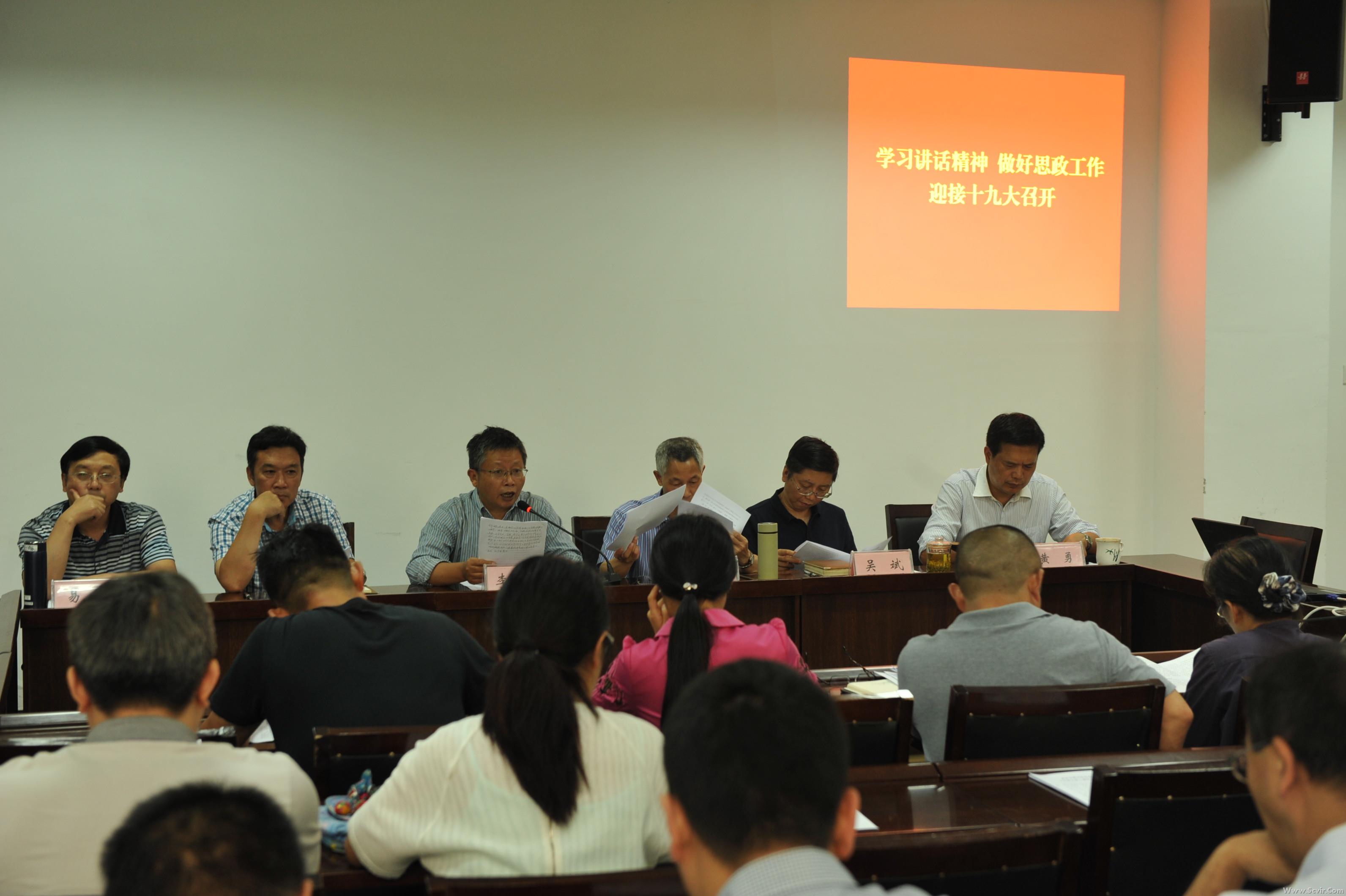 9月26日,学院党委在办公楼一楼会议室召开了2017年党委中心组(扩大)第三次专题学习会,会议主题是:学习贯彻习近平总书记7月26日重要讲话精神,深入领会全国、全省高校思想政治工作会议精神,以崭新面貌迎接党的十九大召开。党委书记李青锋同志主持,全体党委委员和中层干部参加。 李青锋书记为全体与会同志讲了党课,重点对习近平总书记在全国高校思想政治工作会议上的讲话精神做了详细解读。他强调,学校立身之本在于立德树人。要坚持把立德树人作为中心环节,把思想政治工作贯穿教育教学全过程,实现全程育人、全方位育人。要坚持社会主义办学方向,引导学生正确认识世界和中国的发展大势,激励学生自觉把个人的理想追求融入国家和民族的事业中。要推动学校思想政治工作改革创新,制定我院进一步加强思想政治工作的实施方案。他还指出了学校工作中存在的一些问题,发动与会人员积极思考,对面临的形势认识清楚,保持定力,潜心耕耘,不断改革,勇于创新。 党委委员易刚同志作了重点发言,就加强和改进我院思想政治工作提出了自己的思考。针对我院思想政治工作存在的薄弱环节,要完善思想政治工作的机制,加强思想政治工作队伍建设,加强青年教师和生活辅导员队伍建设,加强思想政治工作阵地建设。 党委委员黄勇同志作了重点发言,提出学习习总书记讲话精神,要提升理论素养,并落实到提高工作质量上。 团委书记朱俐、机车车辆系党总支书记王文杰也作了重点发言。 会议集中学习了习近平总书记7月26日的讲话精神,学习了教育部部长陈宝生的文章《切实推动高校思想政治工作创新发展》和《伟大时代需要弘扬黄大年精神》。黄大年同志的感人事迹激发与会人员以更饱满的热情投入到学院的改革发展中,积极迎接党的十九大的胜利召开。