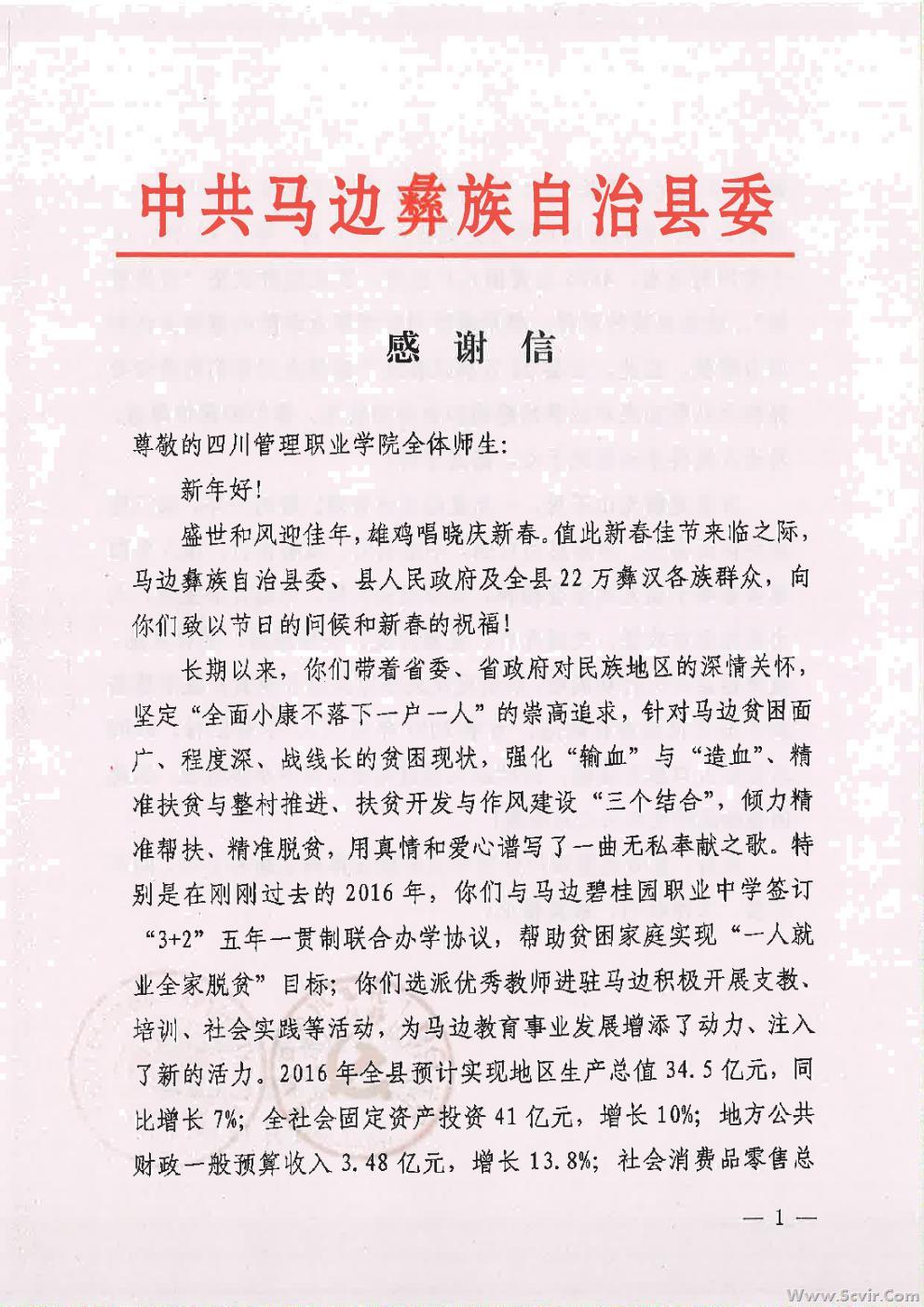 马边彝族自治县县委、县政府致四川管理职业学院的感谢信