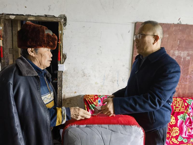 下午,贺兆轩一行来到学校定点帮扶地马边县民主镇玛瑙村,看望慰问学校下派驻村干部李本强、林洪生,详细了解他们在村的工作、生活情况和存在的困难,关心他们的身体健康。随后,深入农户家中开展“走基层、送温暖”活动。在群众家中,贺兆轩与他们亲切交谈,深入了解他们的生产生活条件和教育医疗条件,并向玛瑙村老党员代表、困难群众送去冬被、暖手宝、春联等暖冬慰问品,祝福他们新年快乐,生活幸福。 在新春座谈会上,民主镇镇长张翔对贺兆轩一行的到来表示热烈欢迎,双方就民主镇产业发展、场镇提升、定点帮扶等工作进行了深入交流。贺兆轩指出,民主镇要抓住乡村振兴机遇,集中优势资源,奋力打造龙头产业;要抓好干部队伍,坚定理想信念,发挥中坚力量,让民主镇、玛瑙村更上一层楼。同时,对学校下派驻村干部提出三点要求:一是要沉下心来,踏踏实实地开展工作;二是要走得出去,深入田间地头,密切联系群众;三是要牢记“安全第一”,时刻紧绷安全这根弦不松懈。