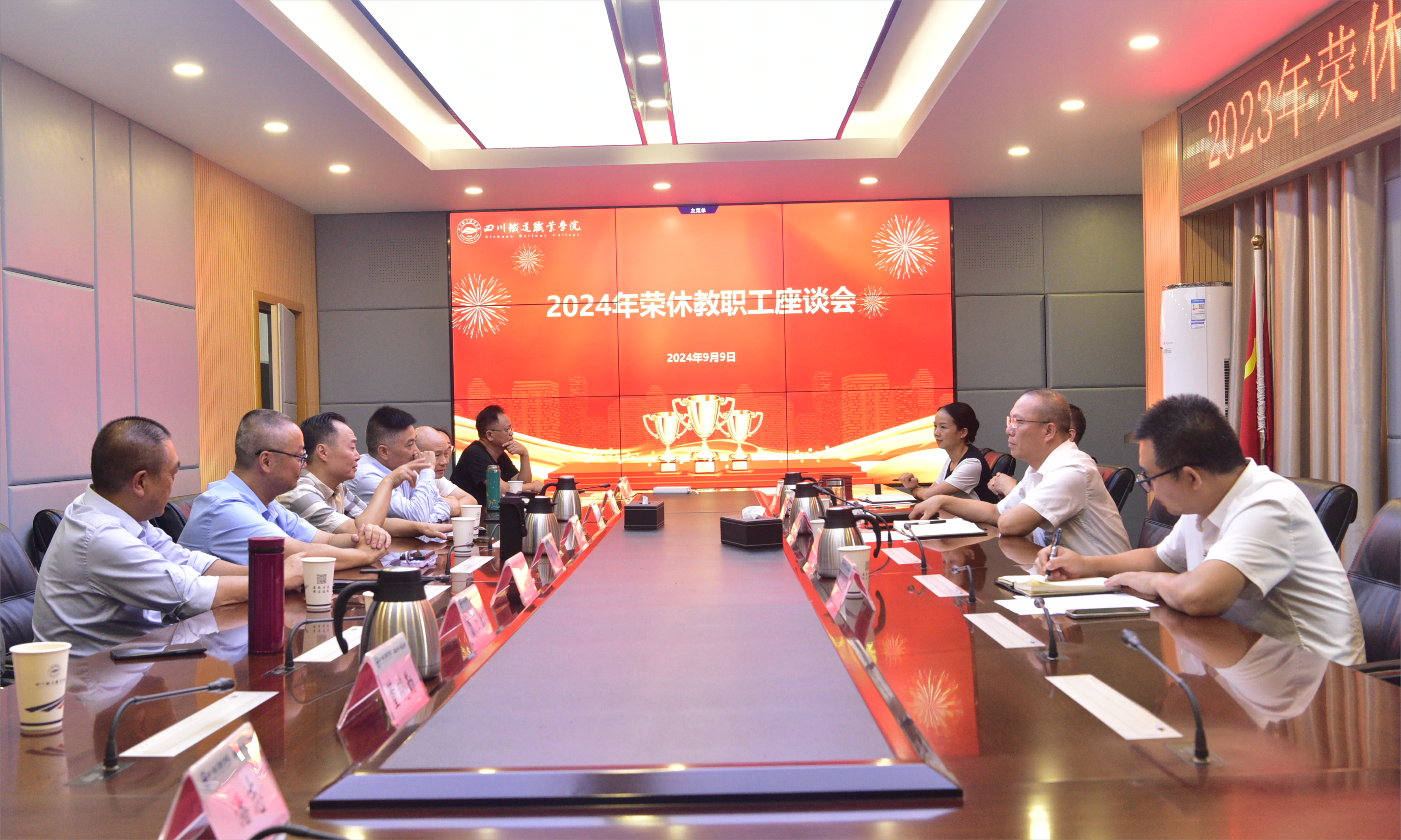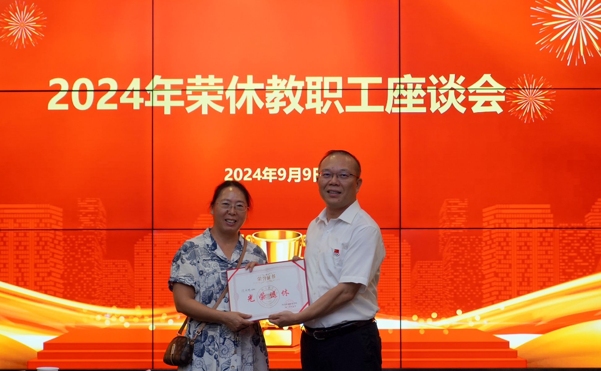 贺兆轩代表学校党委向全体荣休教职工颁发“光荣退休”证书,充分肯定了荣休教职工多年以来对学校的贡献和深厚情谊,学校发展至今,离不开一代代教职工默默付出和无私奉献,以招生线显著提高等成绩为例,向荣休教职工展示学校正在蓬勃发展,希望全体荣休教职工离岗不离心,继续关心、关注和支持学校事业发展,继续发扬吃苦耐劳、艰苦奋斗的高尚品质,共同为川铁职院的发展添砖加瓦,祝愿老同志们平安喜乐,退休生活愉快!