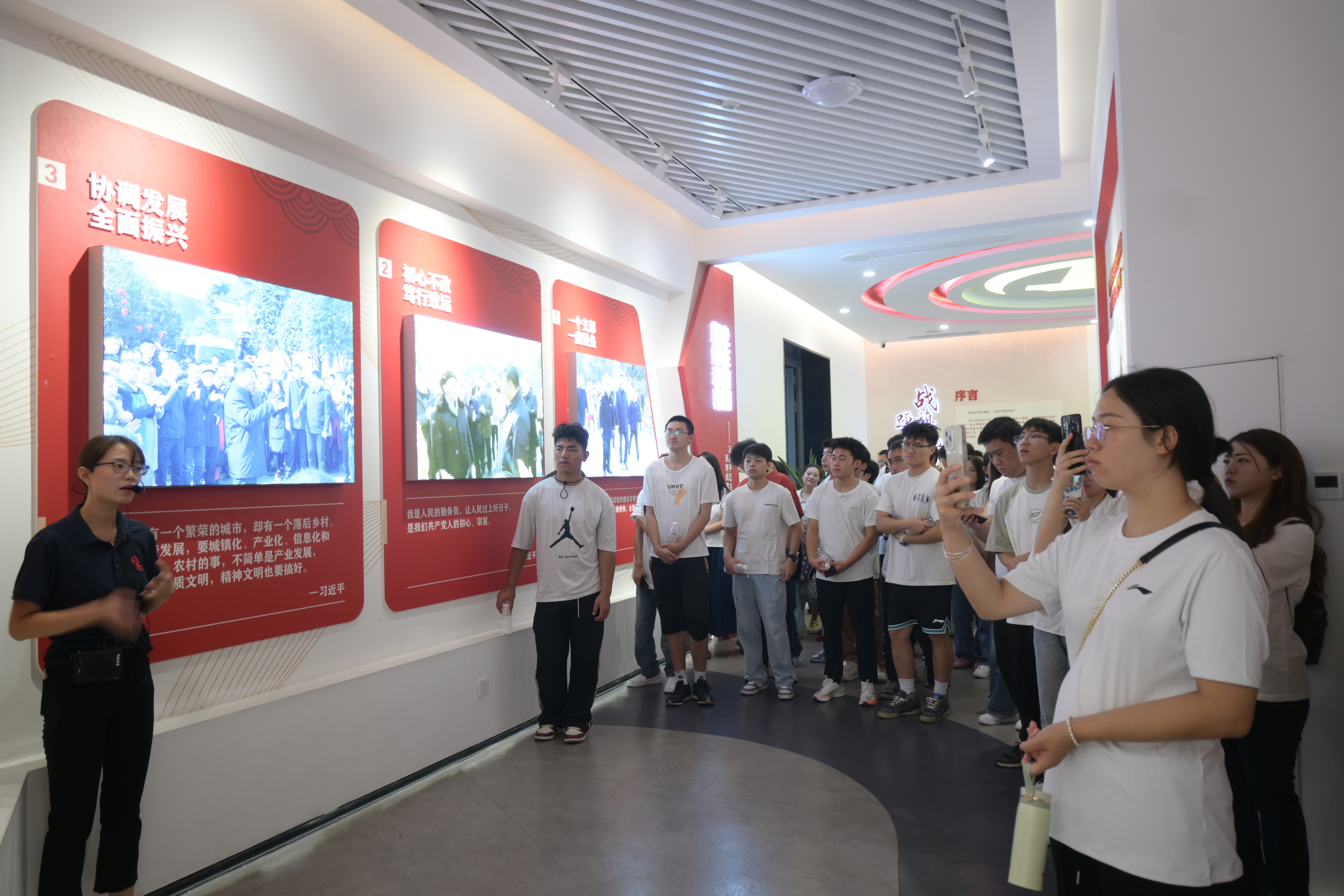 本次“大思政课”采用项目导向、任务驱动模式,坚持教师主导、学生主体的理念,采用“观”“听”“访”“谈”“悟”的方式进行。 “观”巨变。在解说员的带领下,全体师生沿着习近平总书记的足迹,参观战旗村初心馆、特色产业在线服务大厅、郫县豆瓣博物馆以及乡村十八坊等地,全面了战旗历经红色战旗—铜色战旗—绿色战旗的振兴之路,感受战旗村的发展成就及乡村振兴的崭新面貌。