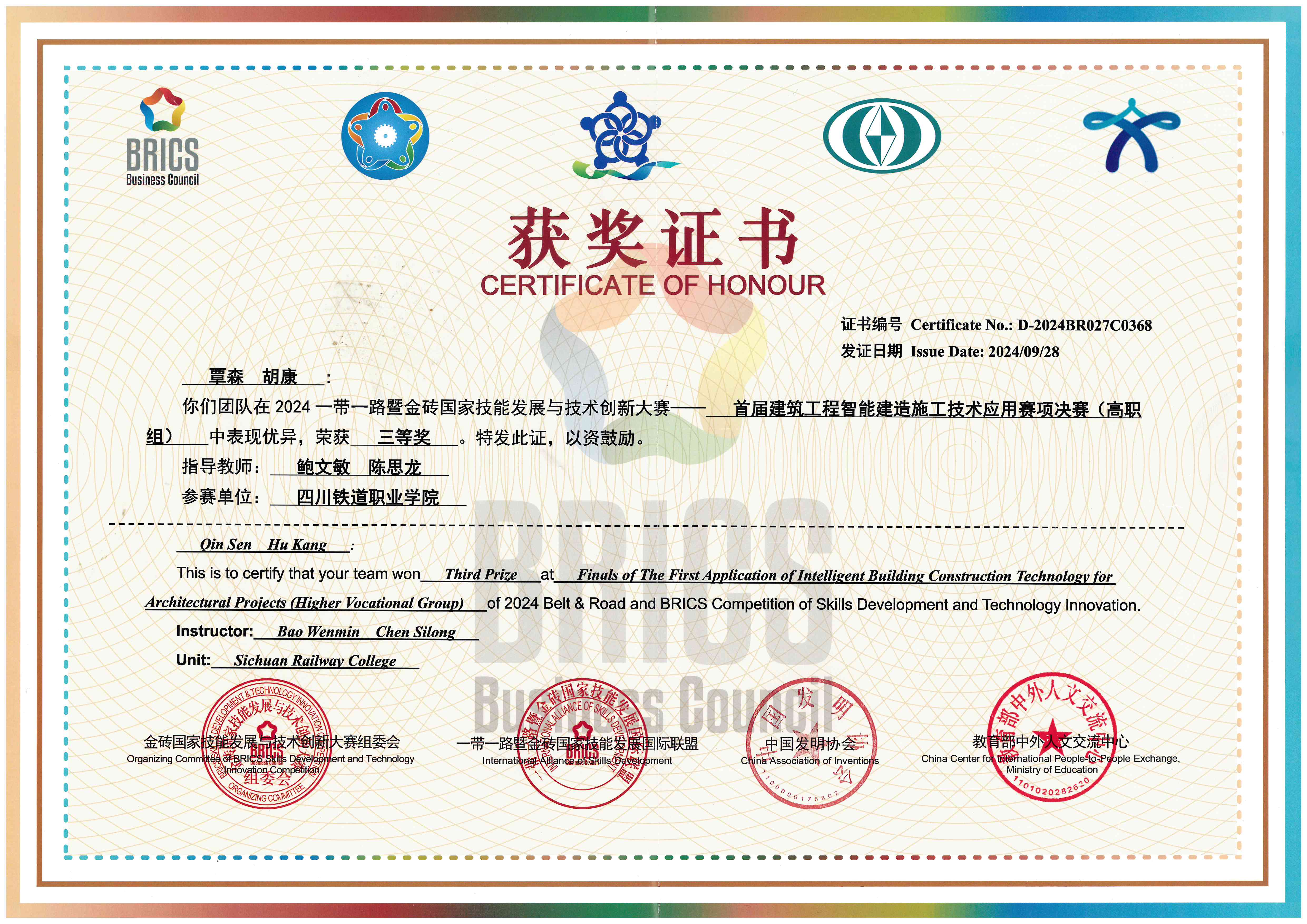 2024年9月26至28日,2024一带一路暨金砖国家技能发展与技术创新大赛首届建筑工程智能建造施工技术应用赛项(BRICS-ST-027)全国总决赛在浙江杭州举行。学校铁道工电学院覃森、胡康学生团队荣获全国总决赛三等奖。 一带一路暨金砖国家技能发展与技术创新大赛是经金砖国家最高领导人会晤筹备委员会认可、中华人民共和国外交部备案、金砖国家工商理事会批准的国际大赛。大赛主要以智能制造、先进制造等技能为核心,关注未来技能人才培养,是推动金砖国家间教育合作、技能开发和人文交流活动的重要平台。建筑工程智能建造施工技术应用赛项以建筑工程施工前沿技术技能应用为主题,结合“双碳”目标与产业绿色转型发展趋势,综合考察选手的建筑施工技术、创新实践等能力。此次全国总决赛汇聚了来自全国超过200所院校的282支精英队伍,他们围绕智能建造技术、建筑工程碳计算等应用与实践领域进行技术交流切磋、激烈对决。米兰官网参赛队伍凭借卓越的创新思维和精湛的技术实力荣获全国三等奖。