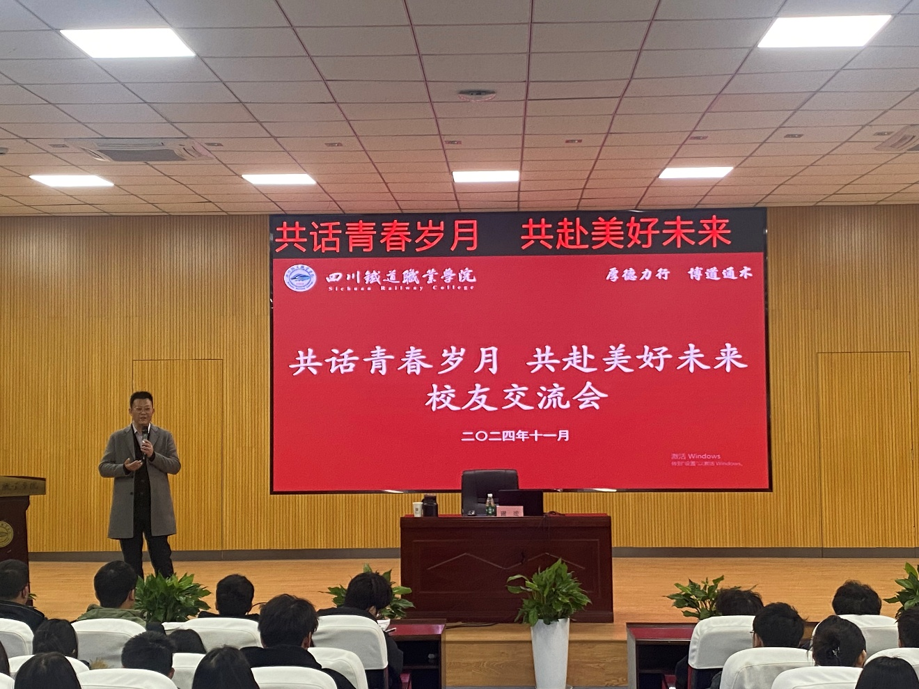 在学生交流会上,谢竑以三个问题开篇,一是学生在学校要学什么?二是学校要培养什么?三是要树立什么样的就业观?他结合自身学习成长经历激励学弟学妹们要好好学习,加强个人品德修炼,不断提升自身综合能力,以个人“形象”展示川铁风采。他鼓励同学们要树立正确的就业观,既要脚踏实地,又要敢于追梦,面对市场的竞争,保持乐观积极的心态。