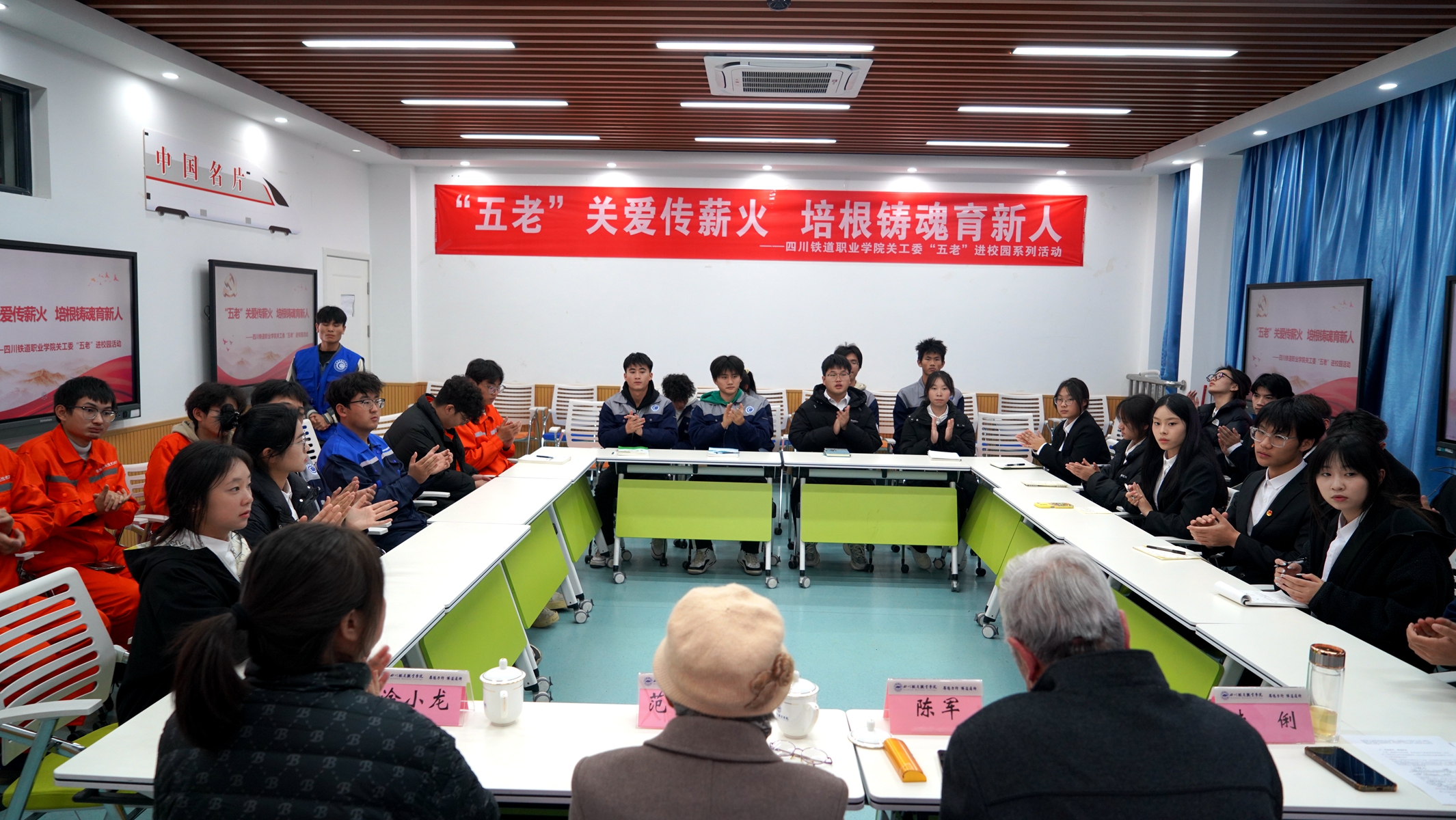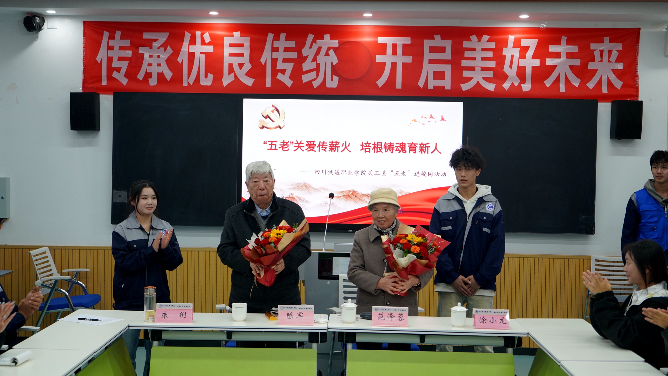 活动中,陈老师和范老师满怀深情地讲述学校发展关键节点、重大事件及教育教学感悟,分享建设中的感人故事,展现了老一辈知识分子矢志不渝的赤子之心和坚定不移的报国之志。他们激励着广大青少年深刻领悟并传承学校“艰苦奋斗、开拓创新、爱国奉献”的优良传统。两位老师殷切寄语青年教师,要不忘初心、牢记育人使命,坚守职业操守与教育初心,秉持仁者爱人理念关爱学生;要有学而知困觉悟,不断提升个人能力和本领,志存高远奉献教育事业。他们寄语青年学生们,要热爱祖国,传承民族精神与学校精神,坚持锻炼,勤奋学习,立志成才,努力成为新时代优秀的川铁人,为实现中华民族伟大复兴的中国梦而拼搏奋斗,书写属于自己的青春华章。