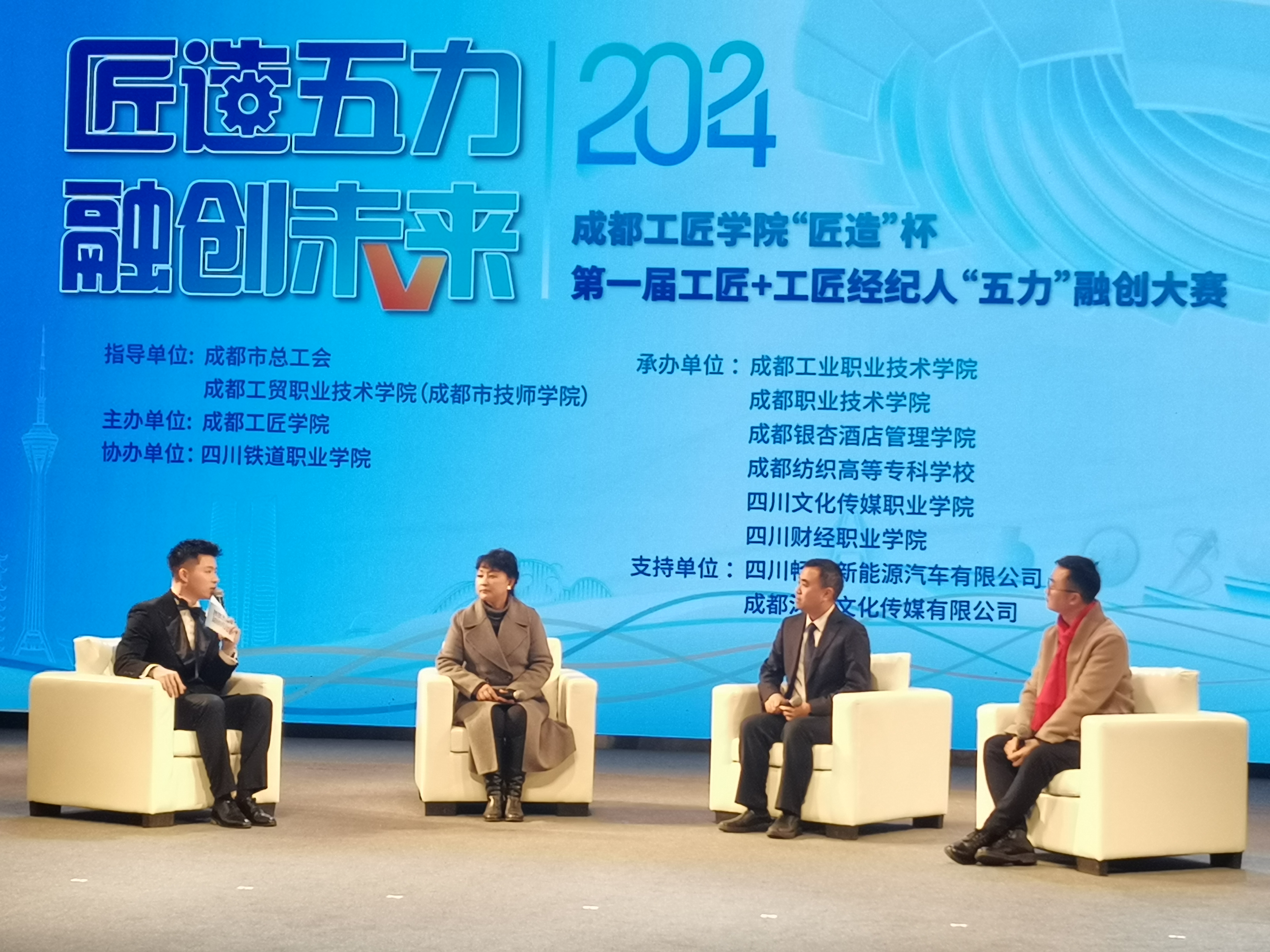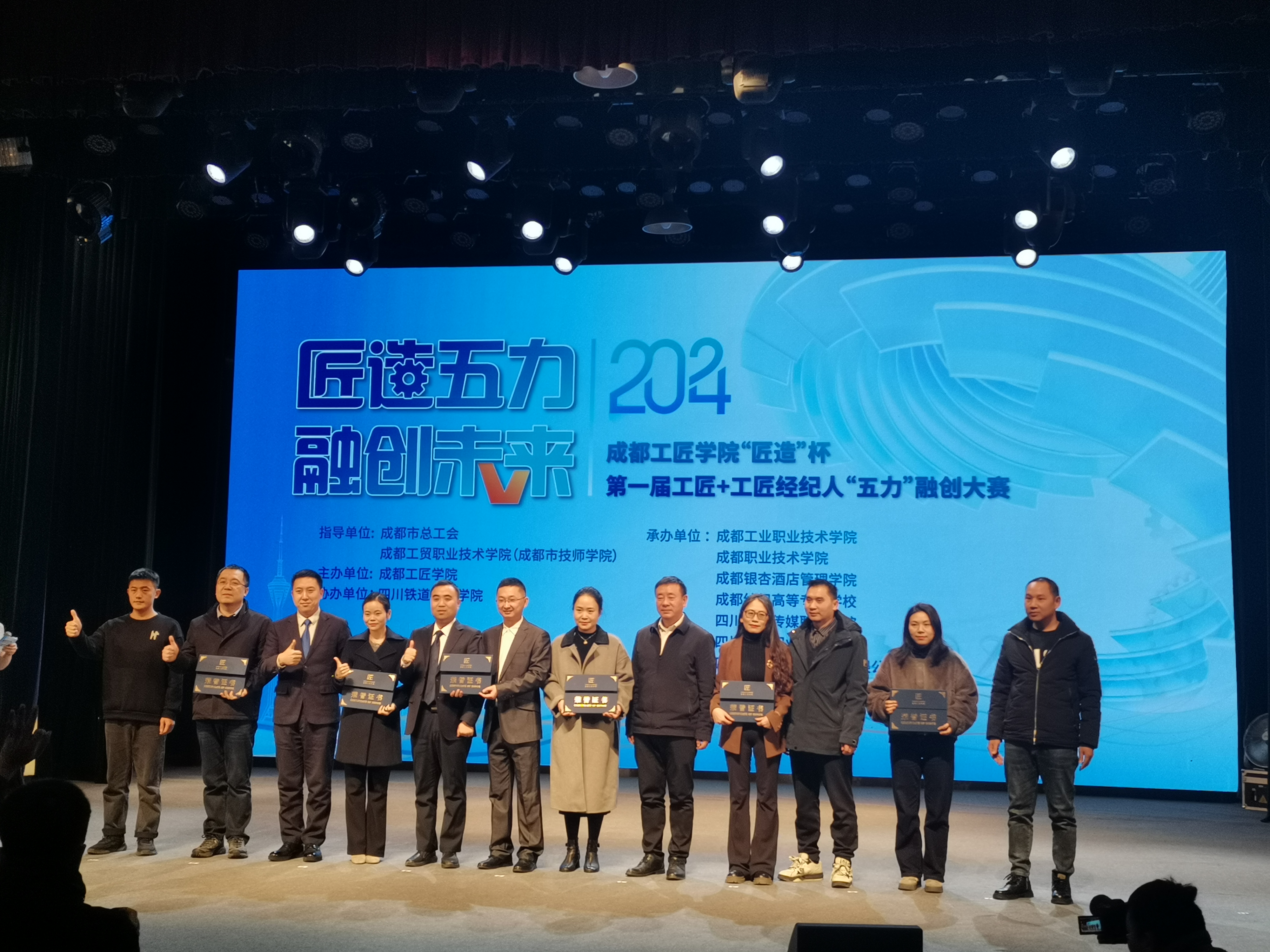 2024年12月27日下午,成都工匠学院“匠造”杯第一届工匠+工匠经纪人“五力” 融创大赛闭幕式在成都市劳动人民文化宫梦想剧场隆重举行。成都市总工会党组成员、副主席方启军以及相关单位院校负责人、工匠代表、企业代表及参赛师生团队出席出席活动。学校党委副书记、校长赖芳应邀出席并为获得“杰出工匠经纪人团队”颁发奖杯。