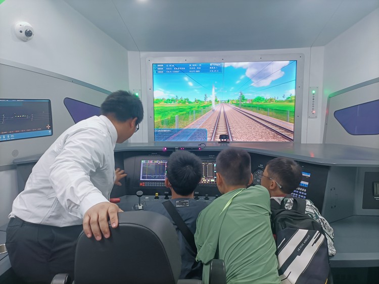 动车组模拟驾驶实训环节,同学们通过执行标准化操作流程,在虚拟调度系统中体验高铁驾驶的责任与使命,通过沉浸式教学场景模拟“复兴号”的高速运行,真切感受铁路科技的魅力。