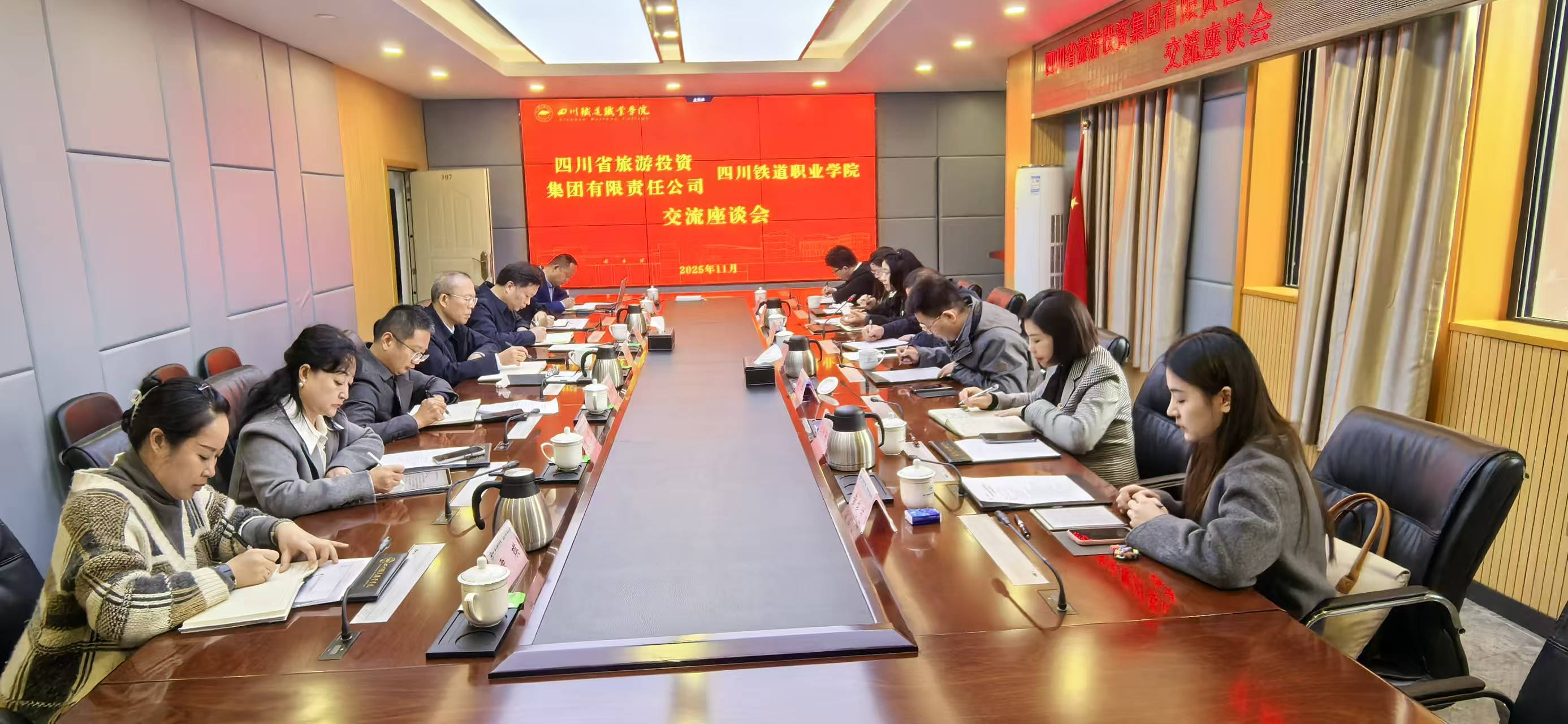 11月14日,四川省旅游投资集团有限责任公司(以下简称 “四川旅投集团”)副总经理伍斌率队来校调研。学校党委书记贺兆轩、副校长黄恩兴出席座谈会,双方聚焦“铁文旅”融合发展进行座谈交流。 座谈会上,贺兆轩对伍斌及管理团队的到来表示热烈欢迎,详细介绍了学校的办学历史、发展定位与专业特色,重点阐述了学校在弘扬铁路红色精神、创新校企协同育人等方面的成果与规划。伍斌对学校深厚的铁路文化底蕴、鲜明的办学特色及人才培养成效给予高度评价。他表示,四川旅投集团正积极布局文旅产业发展,学校专业优势与集团发展战略高度契合,期待双方在人才培养、科研项目等领域开展务实高效的合作。