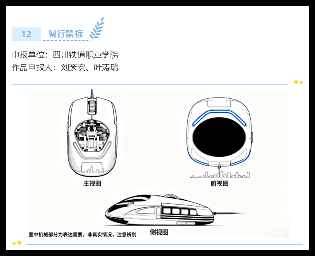 本次大赛以“增进青年对国铁企业的价值认同,激励青年以创新思维为铁路高质量发展注入新活力”为宗旨,面向全国铁路青年职工及铁路院校学生开展,设有“铁路职工IP形象”和“铁路文创产品”两大主题赛道。大赛共征集到铁路职工IP形象121个、铁路文创产品326件。经严格评审,最终评选出5个优秀铁路职工IP形象及若干优秀铁路文创作品予以表彰。 《智行鼠标》创意源于动车组流畅外观与鼠标形态的巧妙融合,将铁路文化元素融入日常办公用品,兼具实用性、创新性与文化内涵。作品围绕铁路文化内核,融合专业所学与创意设计,生动体现了“安全优质、兴路强国”的铁路精神,承载了学子对铁路事业的深厚情感与理解。 获奖学生刘彦宏表示,将以此次获奖为动力,继续深耕铁路文创领域,努力创作更多有温度、有内涵的作品,弘扬铁道精神,讲好中国铁路故事,立足专业、奋勇争先,为铁路文化传播与行业高质量发展贡献青春力量。