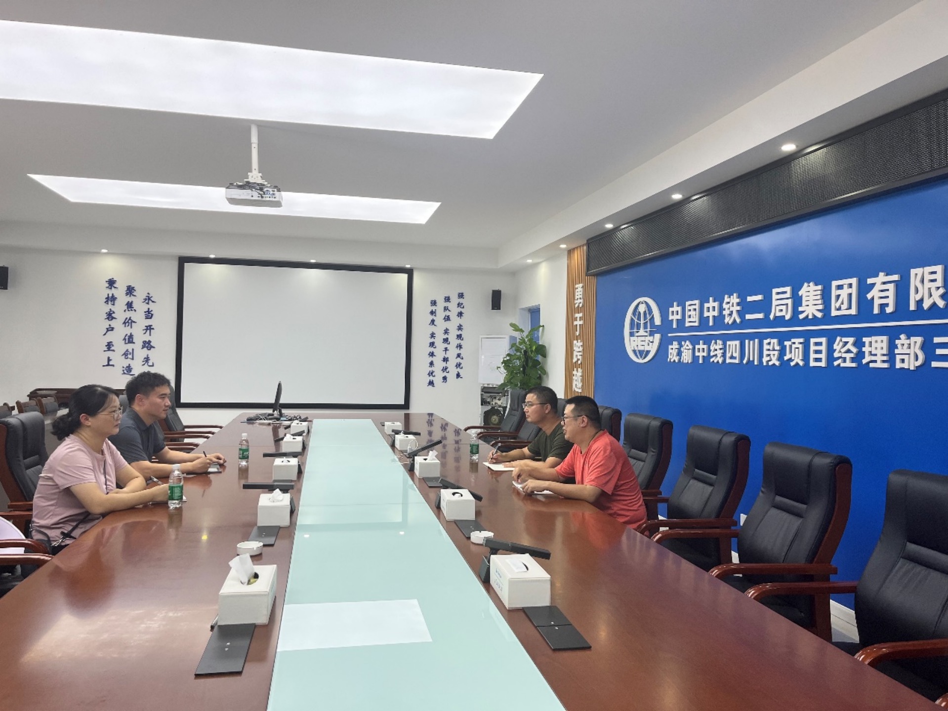 交流会上,江锋首先介绍了铁道工程技术专业的发展历程、专业建设、课程改革、专业优势、学生培养等情况。袁彭向江锋一行介绍了项目部基本情况,智慧梁场建设、技术创新特点,以及梁场的智能建造系统及项目生产过程中的创新应用成果。双方在交流中就工程专业技术服务进行了探讨,双方期待在科研领域展开更多的交流与合作。