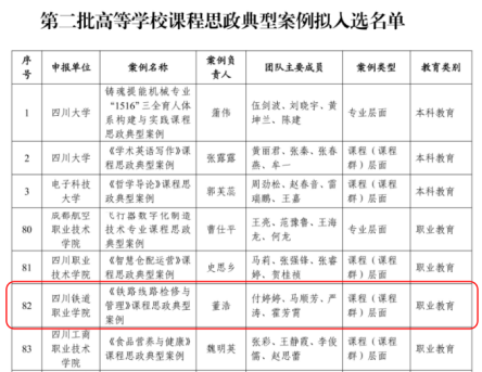 3月17日,四川省教育厅公布了《关于第二批高等学校课程思政标杆院(系)和课程思政典型案例认定名单的通知》,共评选出课程思政标杆院(系)50个、课程思政典型案例110个,学校申报的《铁路线路检修与管理》课程思政典型案例成功入选。