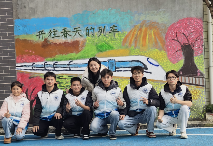 12月2日,团队联合学校成昆线吴场站开放型产教融合实践中心,走进吴场镇社区,开展“开往春天的列车”主题墙绘创作。同学们立足社区实际,融入铁道元素与春日意象,用画笔描绘列车穿梭花海的生动图景。作品既展现了青年学子的艺术创造力,也美化了社区环境,传播了铁路文化,实现专业技能提升与社会服务价值的“双向赋能”,成为社区一道亮丽的文化风景线。