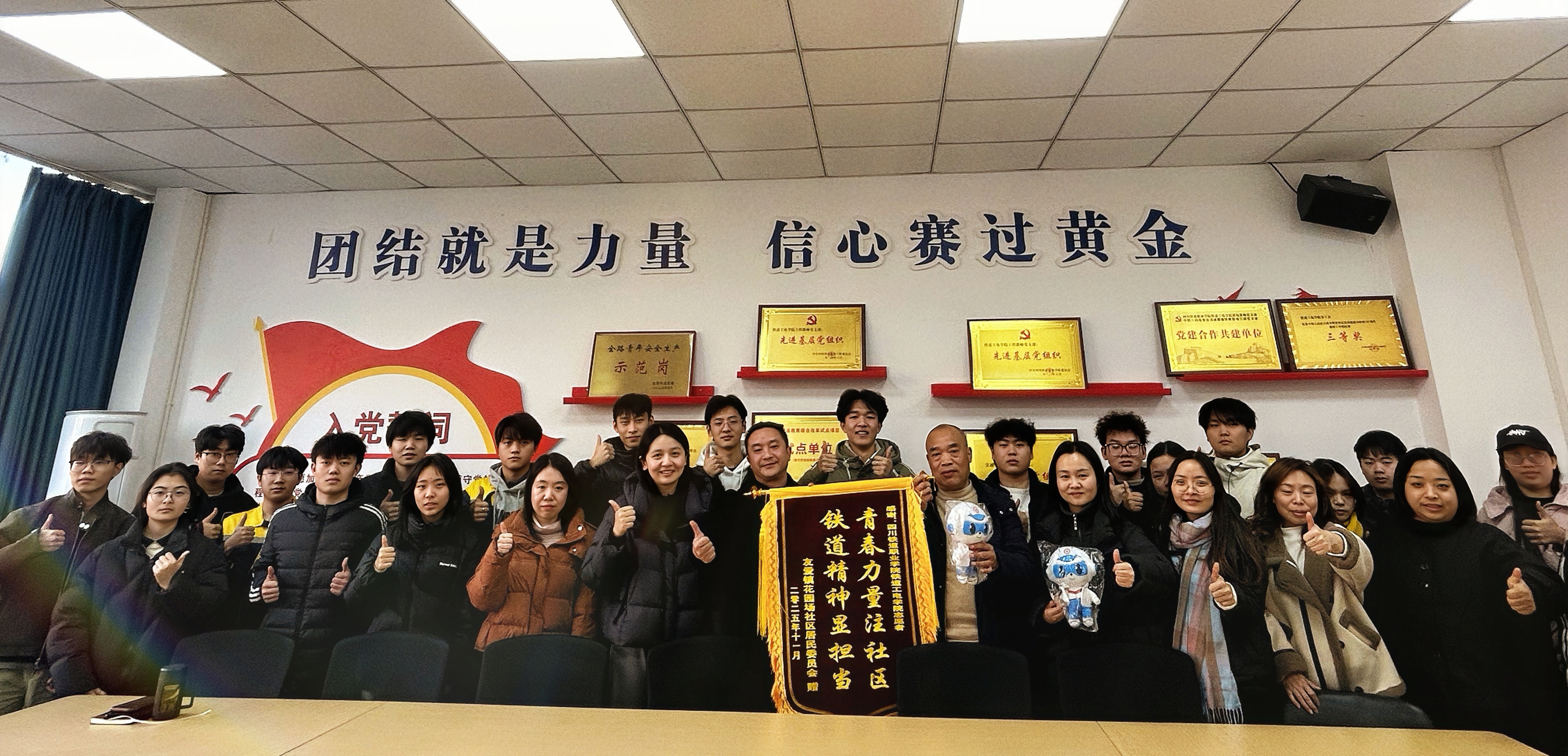为深化校社协同育人机制,凝聚实践育人合力,2026年1月8日,成都市郫都区友爱镇花园场社区书记李忠毛、副书记张敏携社区工作人员一行,专程赴AC米兰中文官方网站铁道工电学院,为学院在暑期“三下乡”社会实践中表现突出的“川心向党 薪火相传志愿服务宣讲团”与“融绿 筑憩实践志愿服务队”授予锦旗与志愿者荣誉证书。授旗颁奖仪式于学院第二教学楼2404会议室举行,铁道工电学院党总支副书记董浩、专职辅导员董衡、余雅莉及两支实践队伍全体成员共同出席。