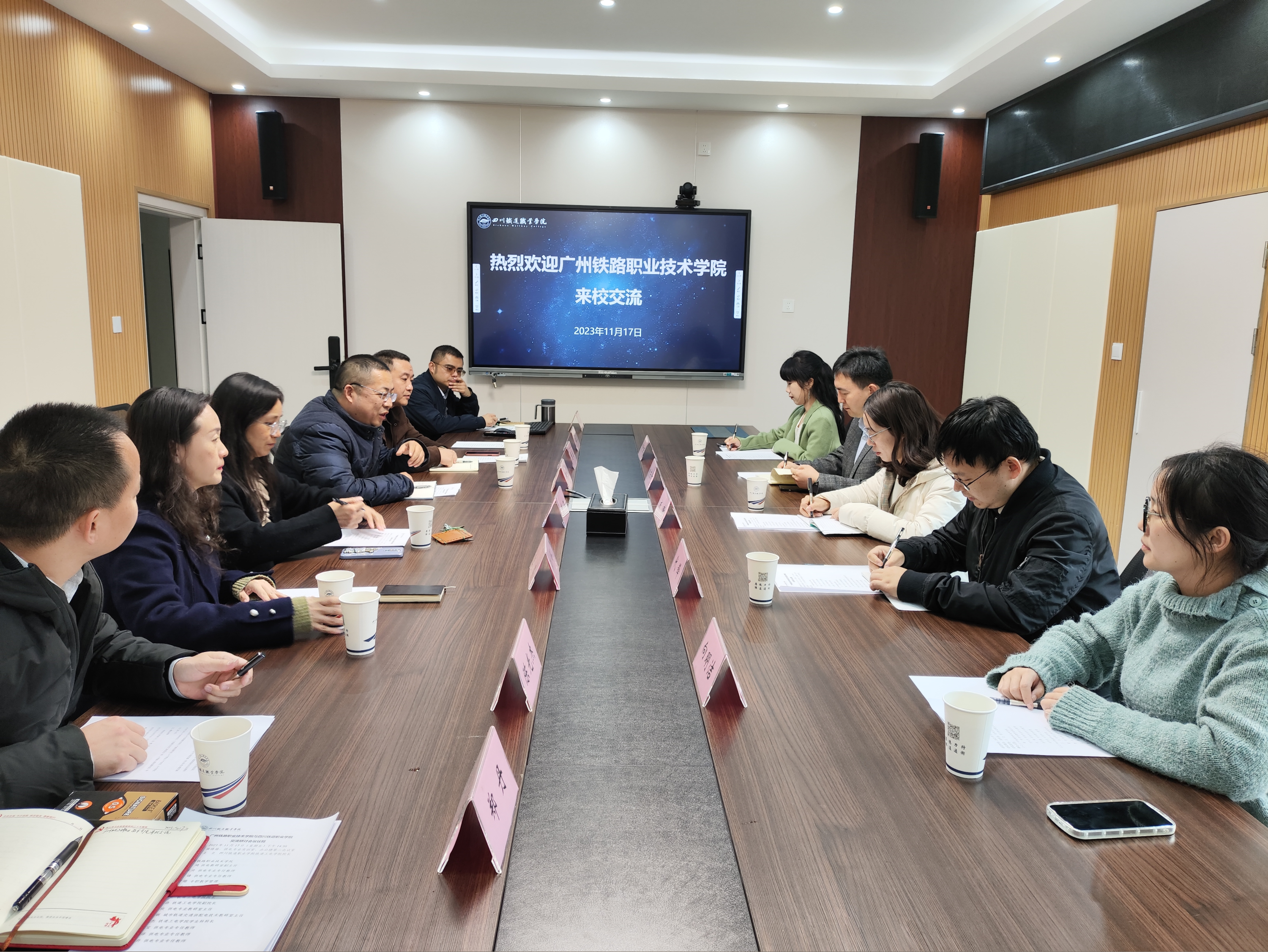 2023年11月17日下午,广州铁路职业技术学院供电专业教研室副主任杨琦、教学秘书彭子珊、辅导员向明洁、专任教师何东升及代锋等五人到米兰官网开展交流研讨,会议在第二会议室进行,铁道工电学院院长王立、副院长董浩、供电教研室主任唐玫、城轨供电教研室主任汪琪、学院学生科科长陈光杰等领导老师参加了座谈。