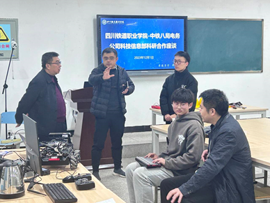 2023年12月1日下午,中铁八局电务公司科技信息部白林部长、项目经理陈友军一行到铁道工电学院开展科研合作座谈会,铁道工电学院教师汪润泽、赵远等老师参加座谈。