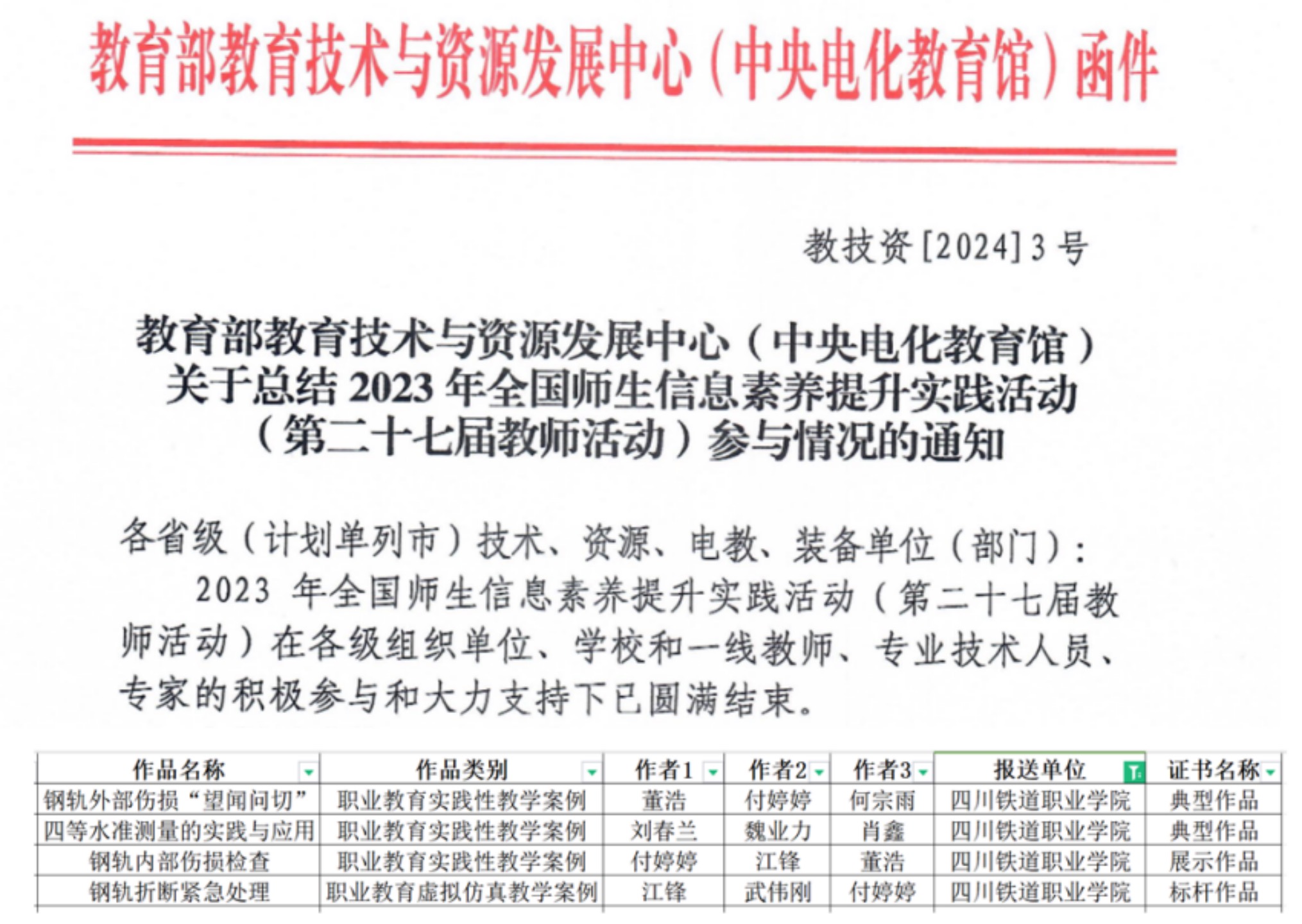 近日,由教育部教育技术与资源发展中心(中央电化教育馆)主办的全国师生信息素养提升实践活动(第二十七届教师活动)结果已公布。由铁道工电学院报送的《钢轨外部伤损“望闻问切”》《四等水准测量的实践与应用》《钢轨内部伤损检查》《钢轨折断紧急处理》4项作品,经校、省两级推荐参加教育部的遴选,被成功认定为典型作品、展示作品、标杆作品。
