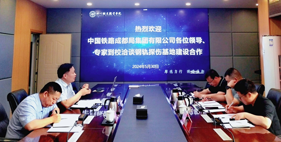 5月30日上午,中国铁路成都局集团有限公司职工培训部副部长刘明、工务部副部长吕元博、钢轨管理中心主任唐军一行来米兰官网洽谈钢轨探伤基地共建项目合作,会议在第五会议室进行,副校长黄恩兴、铁道工电学院院长王立参会。