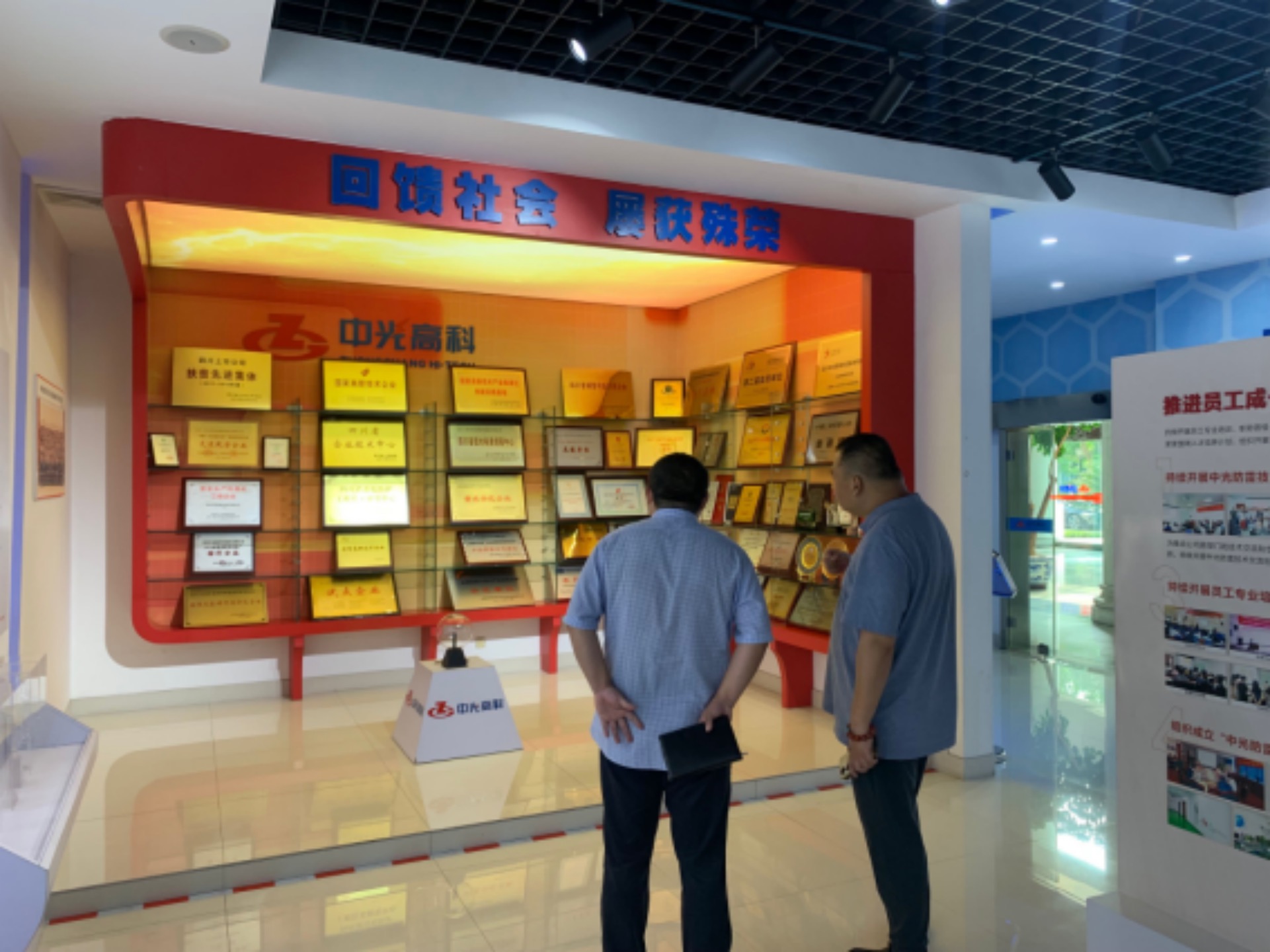 中光防雷科技有限公司总经理助理何剑对铁道工电学院的到访表示热烈欢迎,在企业的文化展厅,何剑详细介绍了中光防雷科技公司的业务范围、标杆产品、企业荣誉、市场定位及未来发展战略。
