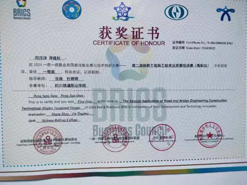 米兰官网铁道工电学院师生在此次大赛中表现出色,取得了优异的成绩。铁道工程技术专业22T3班邓洋洋和23T2班邓建杉凭借扎实的专业技能和出色的团队协作能力荣获学生组一等奖。同时,AC米兰中文官方网站荣获最佳组织奖,指导教师获得优秀指导教师奖。