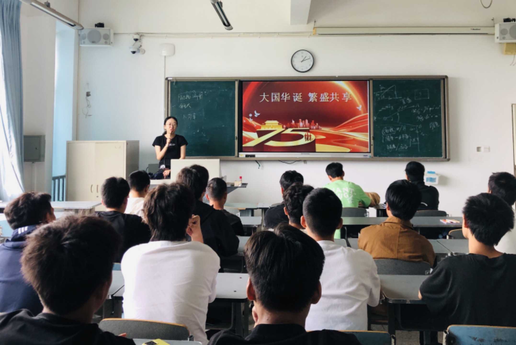 课堂上,各班辅导员通过PPT和视频相结合的方式从经济、政治、文化、社会、国防和军队、科技创新、区域协调发展等方面向同学详细介绍了中华人民共和国成立75周年以来取得的辉煌成就。辅导员结合大学生实际,寄语团员应树立远大理想和目标,为实现国家的发展和繁荣贡献自己的力量。随后,各班团支书及相关班委从青年责任与使命、青年发展与规划等方面分享具体案例,向同学们发出行动倡议,鼓励他们积极投身国家建设、主动参与社会实践,如参加志愿服务、参与科技创新、投身乡村振兴等。
