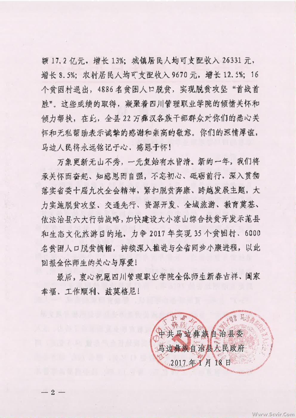 马边彝族自治县县委、县政府致四川管理职业学院的感谢信