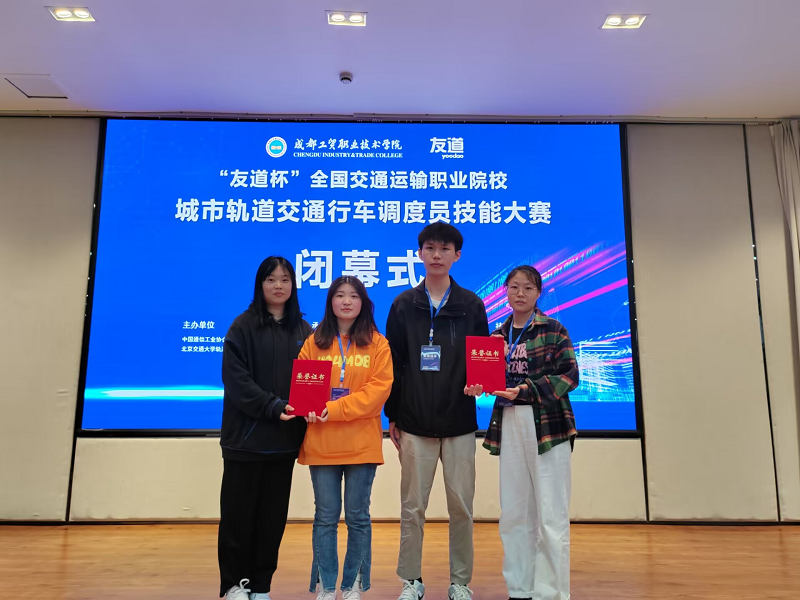2023年4月26日,“友道杯”全国交通运输职业院校城市轨道交通行车调度员技能大赛(四川赛区)在成都工贸职业技术学院成功举办。AC米兰中文官方网站电信工程学院铁道交通运营管理专业学生黄超、徐彩怡和伍钰荷、杨海韵两支团队不负众望分别荣获二、三等奖。