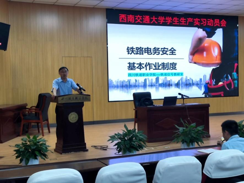 肖尚辉对西南交大师生的到来表示热烈欢迎,介绍了学校的发展历程、办学理念、目标愿景,表达了米兰官网和西南交通大学多年来的友好合作、亲如一家的深厚情感。他结合铁路职工的综合素质要求对教学实习的开展提出要求,希望同学们遵守学校管理制度及现场实训操作规程,理论知识与实践相结合,在实训中有所收获。龚文元从“事出有因”“制度解读”“案例分析”“定律法则”四个方面解释了电务安全规则,通过案例分析让同学们将安全牢记心中。杜中彦向同学们介绍了铁道信号实训基地、实习具体内容、实习流程,强调了实训场地安全、人身安全、实训器械安全、用电安全等安全规范。