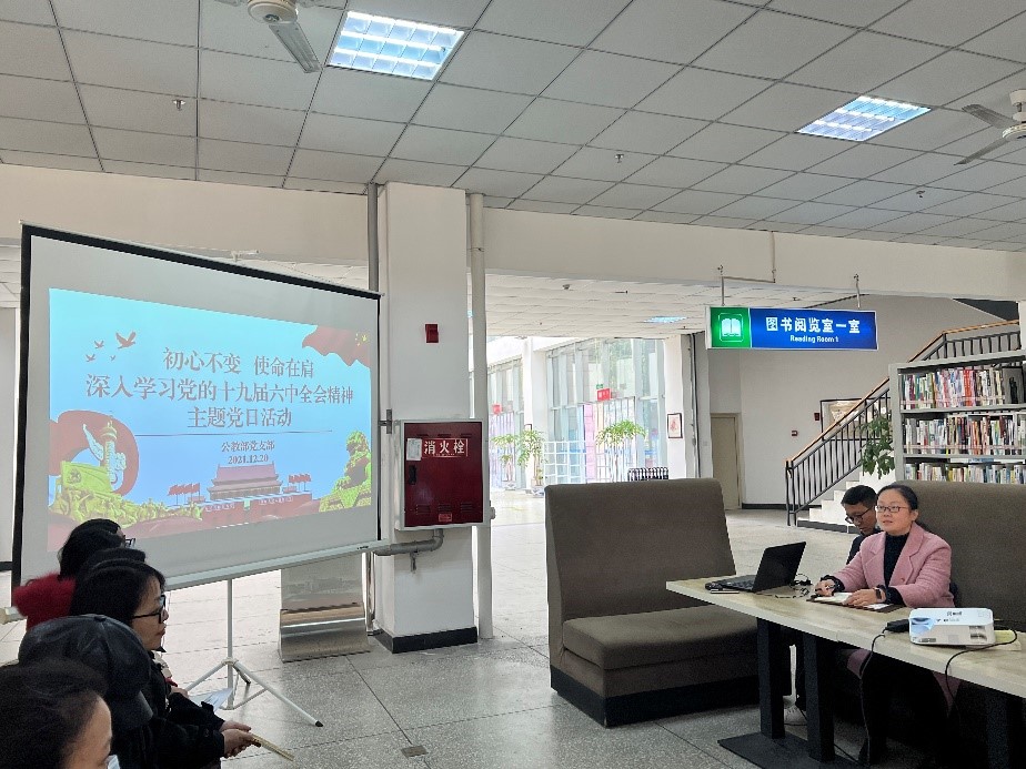 2021年12月20日下午,公教部党支部在图书馆一楼红色书籍阅览区开展“初心不忘 使命在肩——深入党的学习十九届六中全会精神”主题党日活动。宣传委员杨刚同志主持了此次活动。