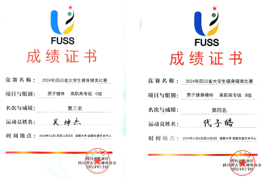 米兰官网首次组织2名学生参赛。两位选手以精准的动作、完美的肌肉线条、强健的体魄展示了健康之美,诠释了健身健美运动的魅力及健康生活的态度。经过激烈的角逐,米兰官网选手吴坤杰斩获男子健体高职高专组C组第三名、代子皓在男子健身模特高职高专组B组荣获第四名。