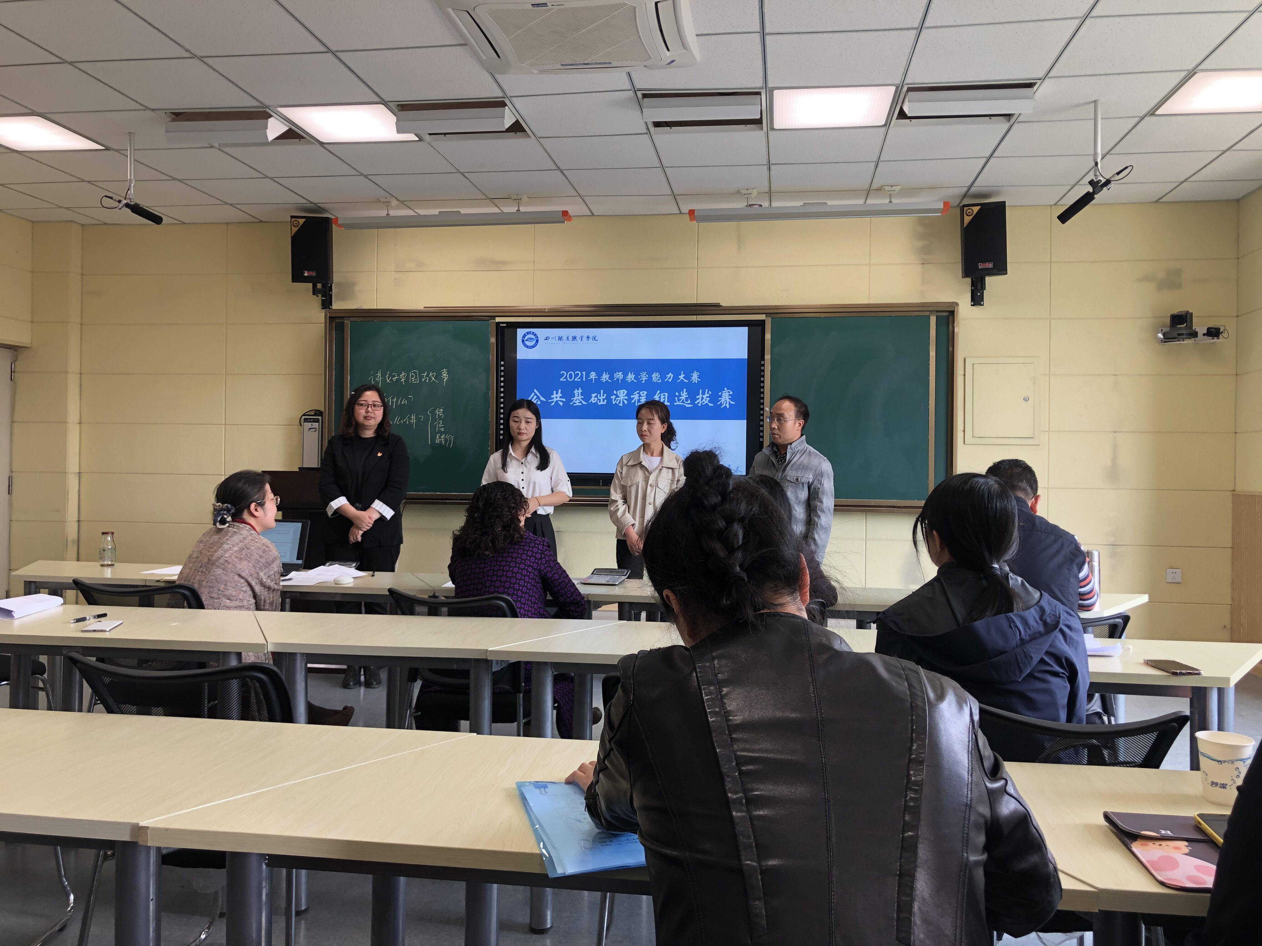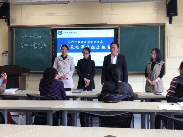 2021年四川省职业院校教师教学能力大赛包括校级比赛、省级初赛和省级决赛。在进入校级比赛前,各系部进行公共基础课程组选拔赛。公共基础课程组选拔赛严格按照相关要求,负责分类组织参赛作品、材料评审,包括内容介绍与教学展示、现场答辩。公教部《高等数学》课程团队和思政部《毛概》课程团队、《心理健康》课程团队三个教学团队进行公共基础课程选拔赛。《国学概论》课程团队因取得2020年四川省职业院校教师教学能力大赛一等奖,直接晋级。各参赛团队汲取部门选拔赛的经验,进一步完善教学实施报告,打磨讲课,从教学方式、教学方法、教学模式、实施手段、课程特色等方面精心设计教学,有机融入职业规范、劳动教育、职业精神等,实现了线上线下混合式教学。针对评委老师的提问,各参赛团队团结协作,认真作答,灵活答辩,阐述对教学设计、教学理念等的理解。赛后,评委老师对参赛团队的综合表现进行了打分。