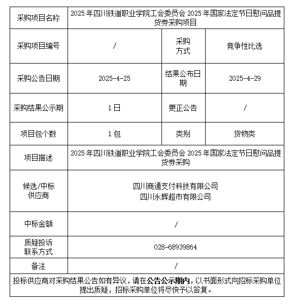2025年国家法定节日慰问品提货券采购项目结果公告