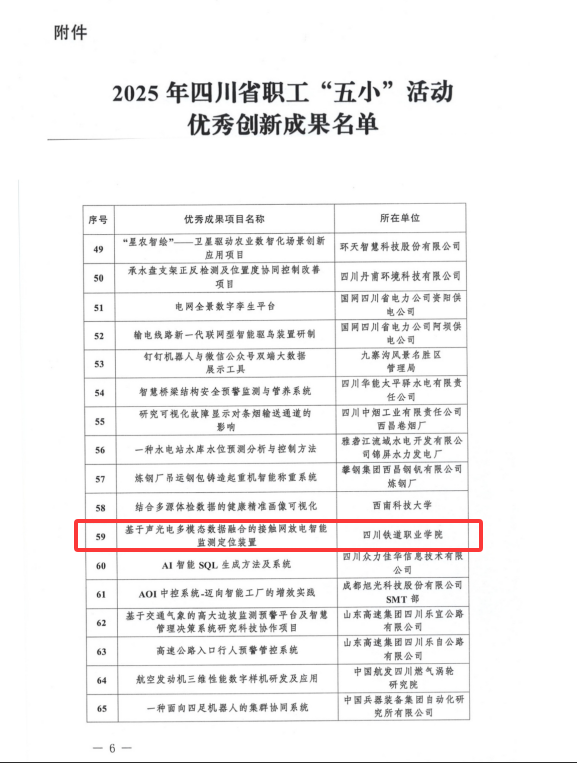 2025年12月25日,四川省总工会办公室发布通报,米兰官网铁道工电学院教师何柏杉团队申报的《基于声光电多模态数据融合的接触网放电智能检测定位装置》项目,荣获2025年四川省职工“五小”活动优秀创新成果。该奖项充分肯定了米兰官网职工在岗位创新中的突出贡献,展现了职工立足一线、以技术赋能产业升级的实践成果。