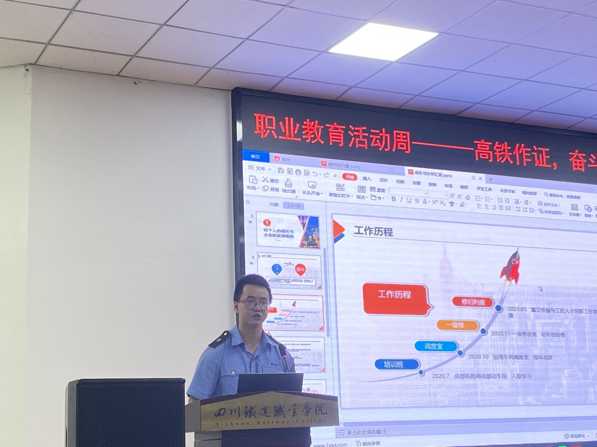 陈守亮是重庆机务段内江运用车间指导司机,工作30年安全行车未发生一次事故和机破,在机务系统大比武中屡获佳绩,现在是成都铁路局首席技师。因疫情原因,陈守亮本次未能到场,通过“历练是一种成长”的报告视频,从传承——遇到一位严厉的师傅、坚守——在平凡的岗位中永葆党员本色、创新——不断练就新技能、开拓——我们都是追梦人四个方面与同学们进行交流分享。