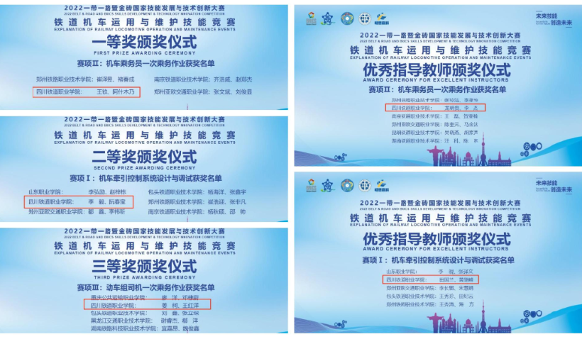 本次竞赛分为三个子赛项,米兰官网铁道机车运用与维护专业21级学子王钦、阿什木乃(彝族)(指导教师龙明贵、李杰)在赛项2机车乘务员一次乘务作业赛项中斩获一等奖;李毅、阮春宝(彝族)在赛项1机车牵引控制系统设计与调试赛项(指导教师田国兰、黄翎峰)荣获二等奖;姜柯、王红洋(指导教师邓勇、罗林顺)在赛项3动车组司机一次乘务作业赛项荣获三等奖。同时龙明贵、李杰、田国兰、黄翎峰四名教师荣获优秀指导教师奖。