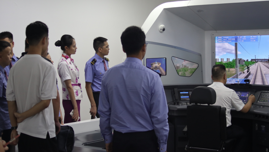 报告团一行在杨海涛、罗林顺等人的讲解下分别参观了HXD3C机车模拟驾驶装置以及CR200J、CR400AF/BF动车组模拟驾驶装置,就地考察了铁道机车运用与维护专业列车牵引控制系统综合应用、动车组驾驶及故障判断处理备赛和培训相关场地和设备,充分感受学校办学条件和办学实力。