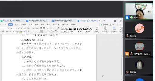 4月12日晚,本学期第三次教学例会通过腾讯会议在线上进行。会议由校党委委员、副校长刘昊君主持。教务处处长、实训中心主任、公共教学部主任、思政教学与研究部主任、各二级学院院长和副院长、校级教学督导员参加会议。
