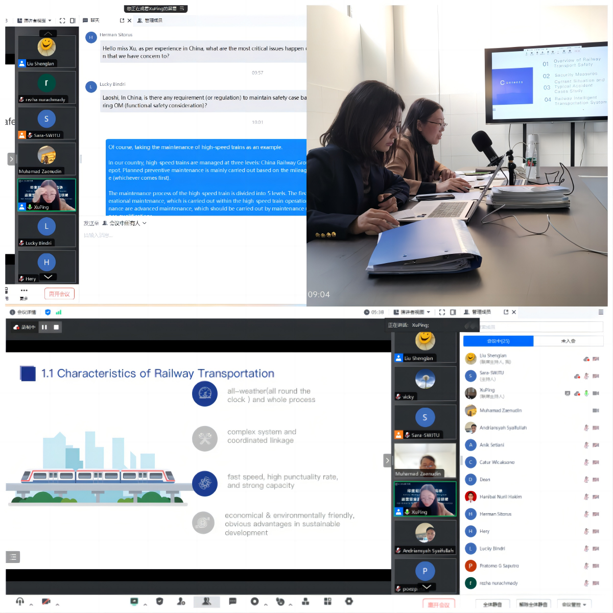 在为期三个小时的教学活动中,刘盛蓝老师、徐萍老师凭借其丰富的经验和专业知识,为学员提供了精彩的授课。教师们首先从真实事故案例出发,让学员深刻领会高速铁路运营安全监督的重要性,随后介绍了高速铁路运营安全的通用知识和技能,接着结合国内外高铁实际运营情况重点介绍了运营安全管理的实施策略,分享先进经验和做法。最后教师们还针对印尼雅万高铁的具体情况进行了详细的分析和讲解,为学员们提供了宝贵的参考和启示。