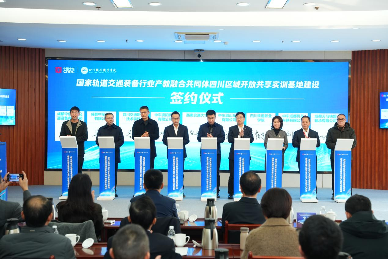 随后,西南交通大学、AC米兰中文官方网站、四川交通职业技术学院、中车成都机车车辆有限公司、中车眉山车辆有限公司、中车资阳机车有限公司、成都天马铁路轴承有限公司、成都今创轨道交通设备有限公司、成都中车电机有限公司等 9 家国家轨道交通装备行业产教融合共同体四川区域开放共享实训基地共建单位代表上台签约,标志着国家轨道交通装备行业产教融合共同体四川区域开放共享实训基地建设正式启动。