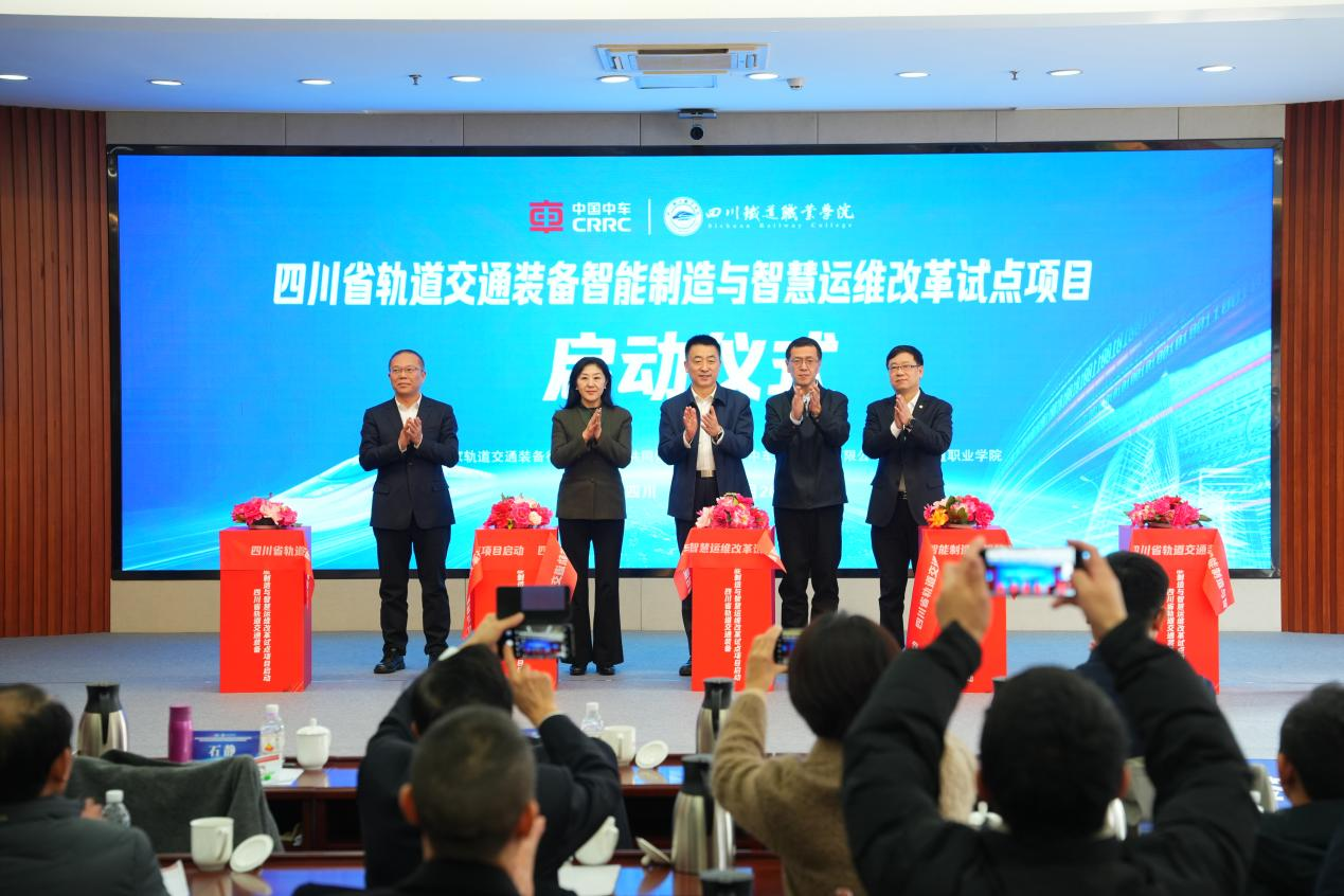 中国中车集团有限公司党委委员、工会主席赵虎,中共四川省委教育工委委员、教育厅党组成员、副厅长石静,眉山市人民政府党组成员、副市长田一澍,AC米兰中文官方网站党委书记贺兆轩,中车眉山车辆有限公司党委书记、董事长胡海滨共同为四川省轨道交通装备智能制造与智慧运维产教融合改革试点项目正式启动剪彩。