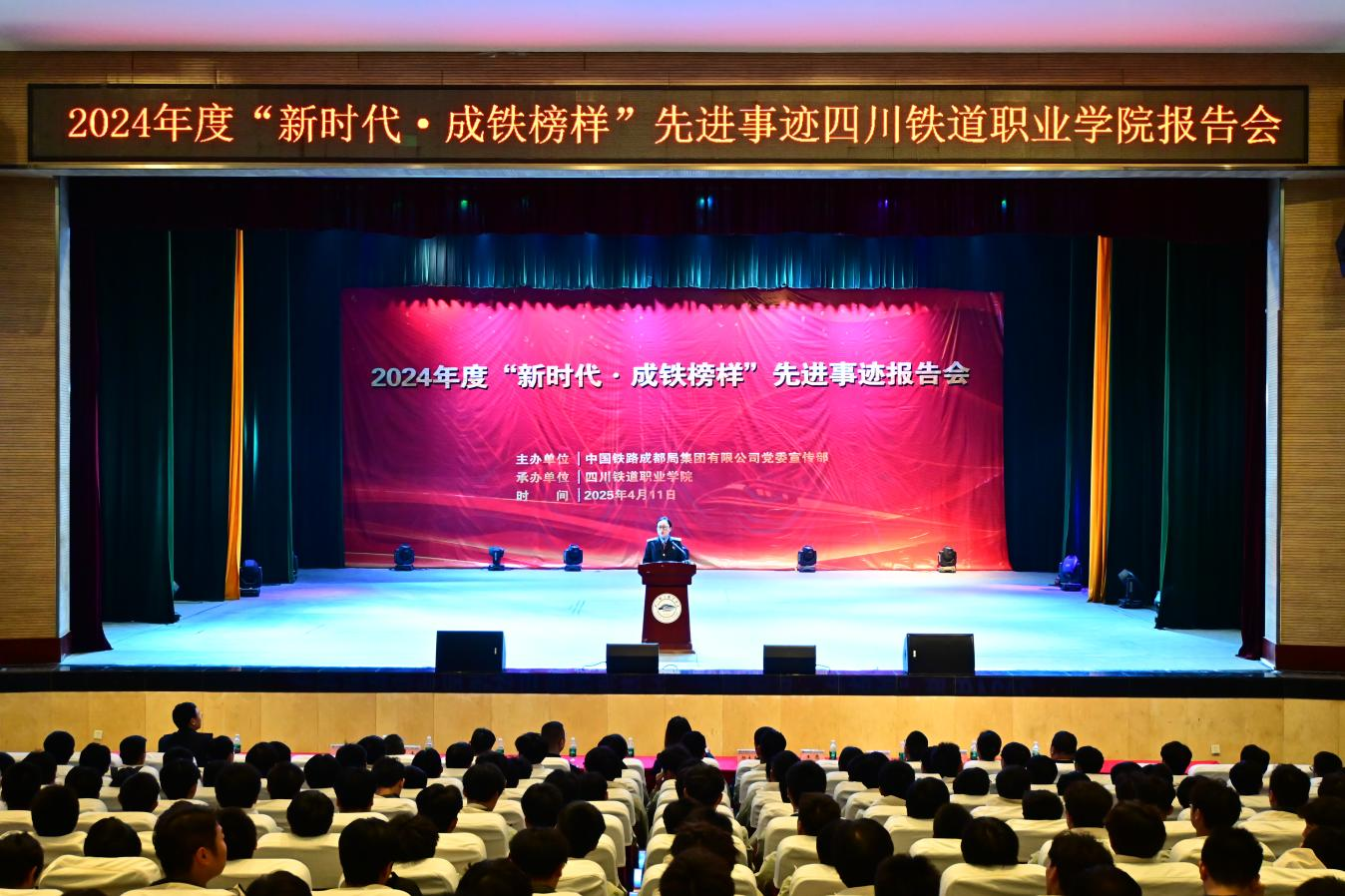 4月11日,为深入学习贯彻党的二十大精神,弘扬新时代铁路工匠精神,激励广大青年学子扎根铁路、建功岗位,米兰官网特邀中国铁路成都局集团有限公司2024年度“新时代·成铁榜样”宣讲团来校开展“奋进改革新征程、建功铁路现代化”主题宣讲活动。10名来自成都局集团不同岗位的先进榜样走进校园,为1400余名即将踏上铁路工作岗位的师生带来了一场震撼心灵的“精神盛宴”。