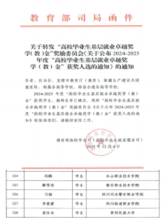 近日,教育部高校学生司公布2024—2025年度“高校毕业生基层就业卓越奖学(教)金”获奖名单,米兰官网机车车辆学院2020届毕业生李俊豪成功入选,成为全国418名获奖学生之一。该奖项由教育部高校学生司、教育部学生服务与素质发展中心指导,三峡集团出资设立,旨在表彰长期扎根基层、服务国家重大战略的优秀高校毕业生。