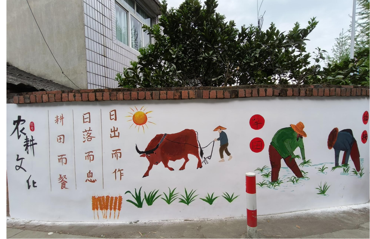 活动中,志愿者们怀着对乡村的热爱,围绕“春耕秋收”“传统农具”“田园风光”等主题精心创作。老农头戴斗笠,牵牛耕地,身影坚毅;插秧之人弯腰劳作,专注于水田。这不仅是劳作场景,更是中华民族与土地共生、对丰收祈愿的文化传承。“日出而作,日落而息,耕田而餐”,古朴文字与农耕元素相映成趣,生动展现传统农耕生活和文化。