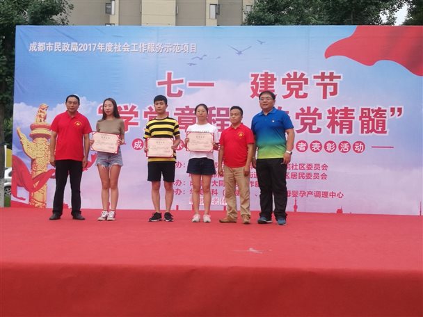 2018年6月29日,我院青年马克思主义者学习研究社(以下简称“青马社”)成员孙于涵、苟岚涵、徐俊才受郫筒街道书院社区居委会的邀请,参加书院社区主办的七一建党节“学党章程 传党精髓”成都市示范项目暨志愿者表彰活动。