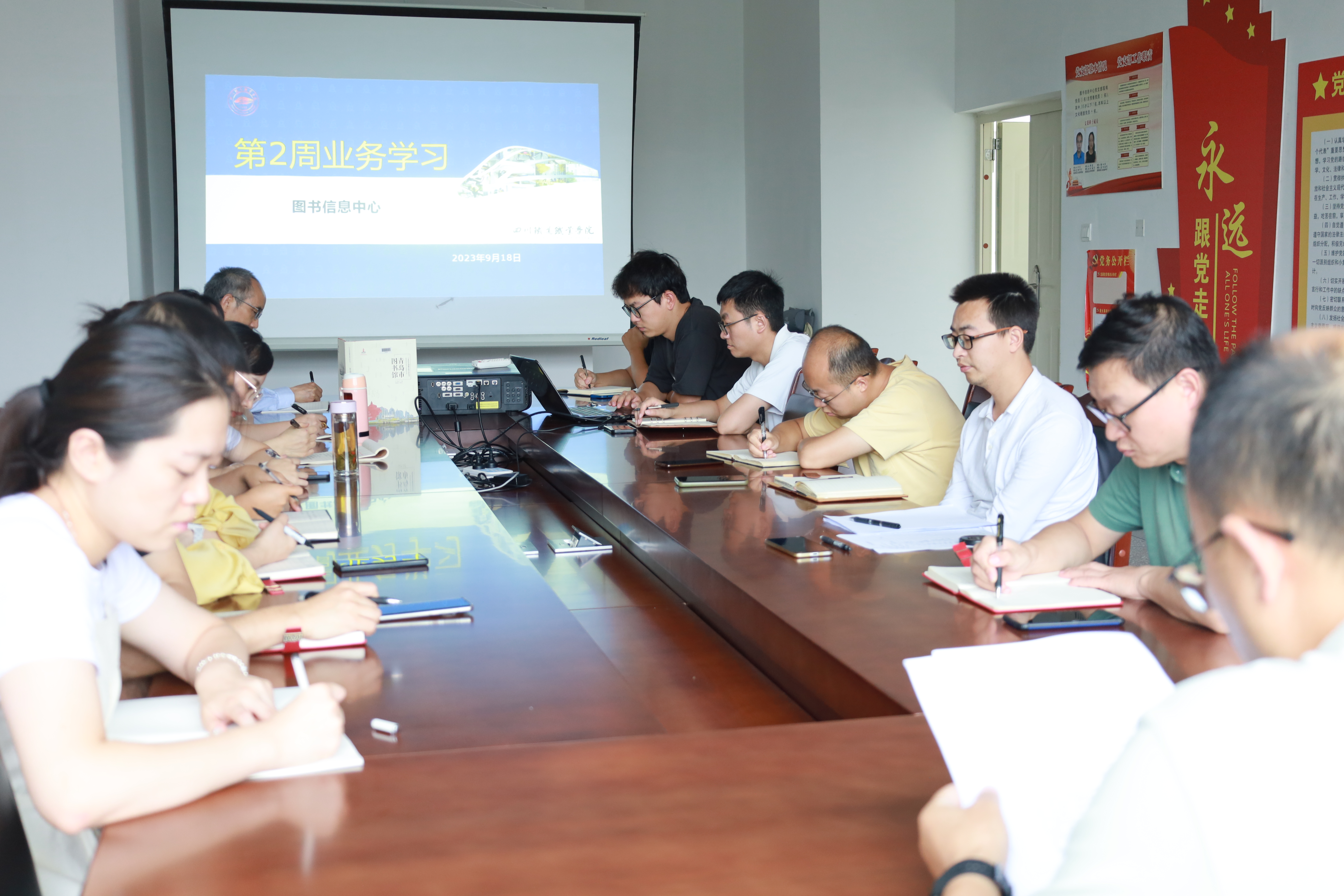 9月18日下午,全体教职工在图书馆三楼会议室开展业务学习、工作部署会,何中华主持会议。