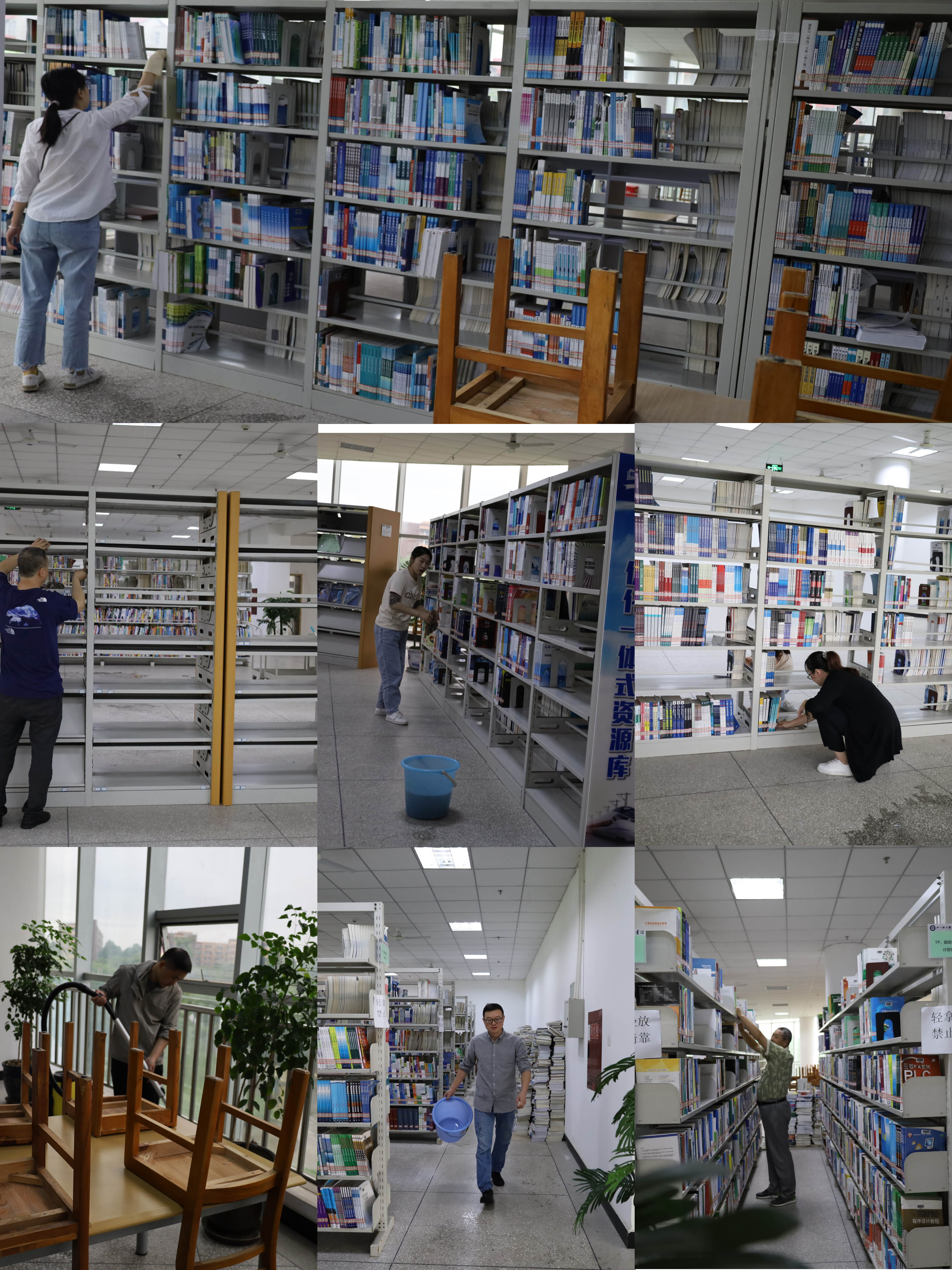 图书服务部教职工打扫图书馆一至三楼阅览室卫生
