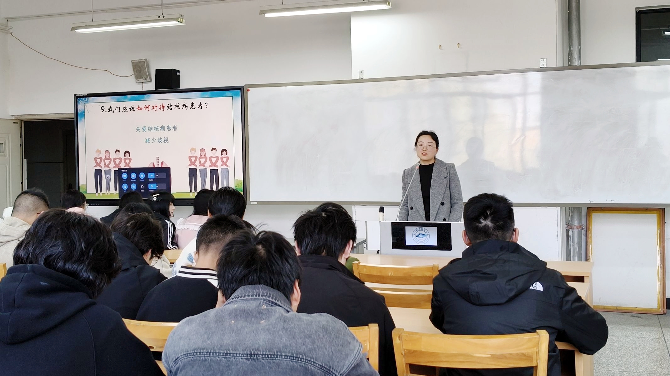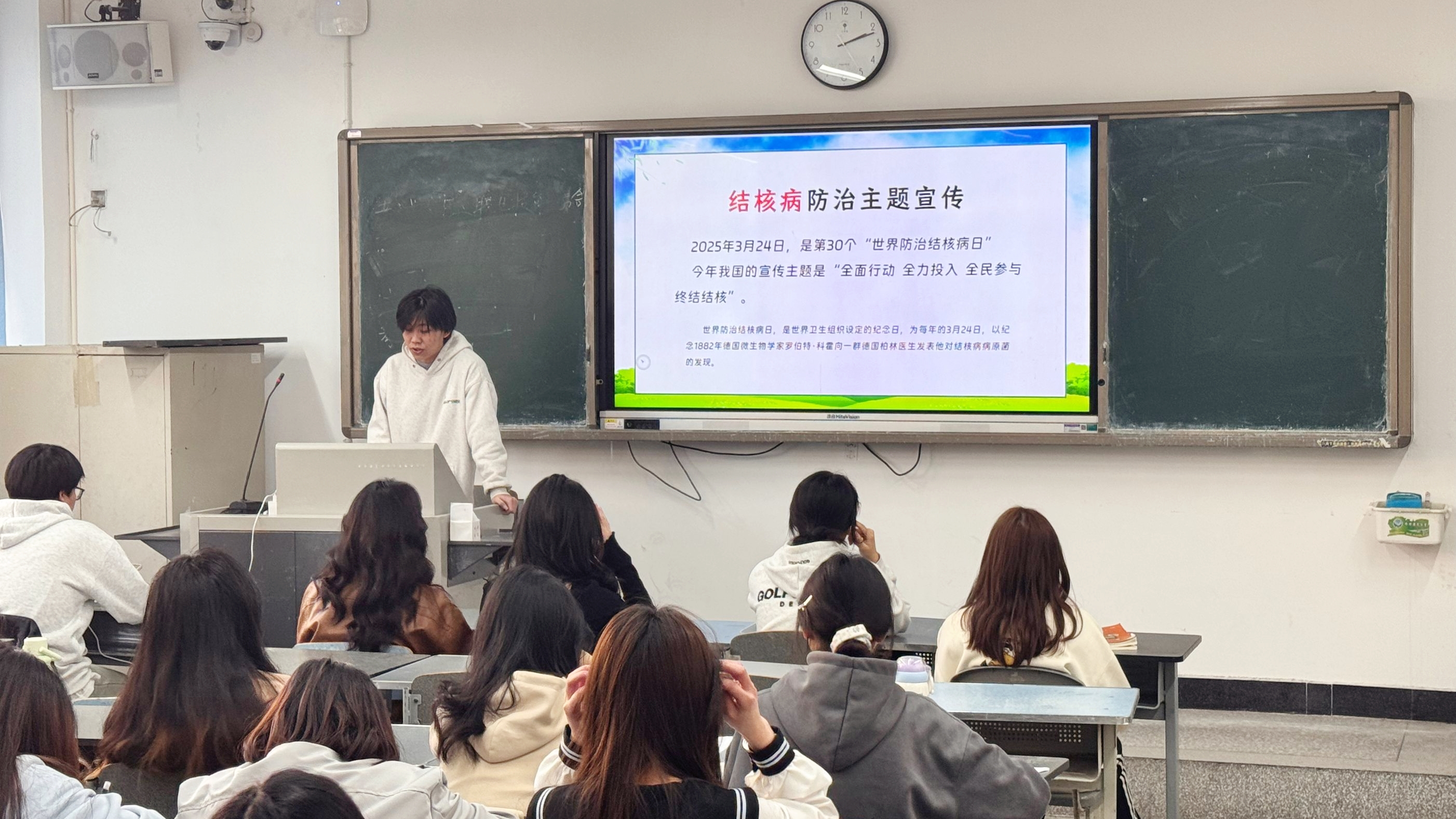 各二级学院利用周一班团活动课组织同学们集中学习结核病防治科普知识,既有老师们耐心细致的答疑解惑,也有同学们热情洋溢的感受分享,进一步在学校内营造了全民参与共同终结结核的良好氛围。